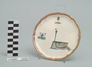 - NOTIZIE STORICO CRITICHE Il piatto da dolce in esame fa parte del servizio forma "Vecchio Milano" con decoro "Lago Maggiore": vi sono raffigurati uno scorcio minore (un molo con faro e barca da pesca caratteristica del Lago maggiore, detta burchiello) ed elementi caratterizzanti la vita del lago (un pesce lasciato ad esseiccare su uno scoglio e una boa lumonosa), rappresentati in un'atmosfera sospesa e silenziosa, seppur ridente nella resa stilizzata e nel fresco cromatismo delle raffigurazioni. Fin dalla sua nomina a direttore artistico della "S.C.I.", Guido Andlovitz si prefisse di rigenerare le forme tradizionali con decori nuovi. E' il caso della forma "Vecchio Milano" cui adattò nel 1931 il nuovissimo decoro "Lago Maggiore", a conferma che una decorazione nuova, se concepita organicamente, può conferire un aspetto attuale e "scattante" anche a una bella forma tradizionale. Fu certamente uno dei servizi più prestigiosi della produzione del momento se Andlovitz lo concepì in piccolissima serie e se l'azienda gli consentì - caso unico- di firmarlo nella marca. La scritta Verbano e la data 1931 presenti nel marchio suggeriscono che probabilmente il servizio fu realizzato per celebrare nel 1931 l'inizio della produzione di porcellana da tavola a Laveno nello stabilimento Verbano. Nell'ambito dei repertori decorativi creati dall'Andlovtz il decoro "Lago Maggiore" rappresenta un modo frazionato di raffigurare il paesaggio, definito da Mario Munari a "scena spezzata". L'impianto decorativo di queste ceramiche rifugge dalla centralità e dalla strutturazioni lungo diretrici ortogonali, mentre vi predominano l'asimmetria e le fughe visuali sghembe che risentono del gusto per la cineseria e il giapponismo. La semplificazione geometrica degli elementi e il modo di sfumare i corpi nel'intento di suggerirne la volumetria ricorda le opere di Carlo Carrà degli anni venti. Nel decoro "Lago Maggiore" sono presenti espressioni diversificate di un tema molto caro a Guido Andlovitz: i "paesaggi d'acqua" con particolare ricorrenza delle 'barche' raffigurate in una vasta gamma di tipi, generalmente riprese da modelli reali e con divertenti variazioni fantastiche. Il decoro Lago fu applicato in un primo momento sulla forma "Vecchio Milano", poi sulla forma "Pomezia" (1936 ca.). Del decoro Lago esistono diversi disegni originali a matita, pastello, inchiostro e acquerello su carta conservati nel fondo archivistico della "S.C.I.": alcuni di questi raffigurano il decoro proprio sulla forma "Vecchio Milano" con le rifiniture che compaiono sui pezzi finiti. Nel Museo è conservato anche un altro servizio forma "Vecchio Milano" con decoro "Lago Maggiore", ma più ridotto nella quantità e nella varietà dei componenti e con filettatura monocroma (num. inv. 2051...3517). Negli anni '90 la Richard Ginori ha rimesso in produzione il servizio Lago.\nIl servizio in esame è eseguito a colaggio, mentre i decori sono realizzati a decalcomania (o transfer): si vedano in proposito le lastre in rame acciaiato conservate nel Museo e raffiguranti molti dei decori presenti nel servizio in combinazioni diversificate (nn. inv. 2480, 2483, 2484, 2485). Tipologicamente si lega ad un servizio da caffé (num. inv. 2672...2900).\nIl piatto da dolce è stato donato da Vanna Scotti Meregalli, nipote di Vanna Scotti, figlia dell'Ing. Luciano Scotti che fu direttore generale della "S.C.I." dal 1916.