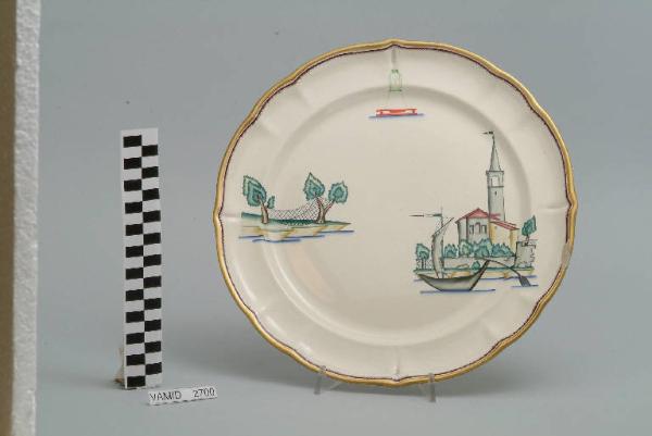 - NOTIZIE STORICO CRITICHE Il piatto da portata in esame fa parte del servizio forma "Vecchio Milano" con decoro "Lago Maggiore": vi sono raffigurati uno scorcio del Lago Maggiore (una chiesa vicina alla riva del lago da identificarsi probabilmente con quella di Laveno-Mombello) ed elementi caratteristici della vita sul lago (le reti da pesca stese ad asciugare alle fronde degli alberi sulla riva del lago e una boa luminosa) rappresentati in un'atmosfera sospesa e silenziosa, seppur ridente nella resa stilizzata e nel fresco cromatismo delle raffigurazioni. Fin dalla sua nomina a direttore artistico della "S.C.I.", Guido Andlovitz si prefisse di rigenerare le forme tradizionali con decori nuovi. E' il caso della forma "Vecchio Milano" cui adattò nel 1931 il nuovissimo decoro "Lago Maggiore", a conferma che una decorazione nuova, se concepita organicamente, può conferire un aspetto attuale e "scattante" anche a una bella forma tradizionale. Fu certamente uno dei servizi più prestigiosi della produzione del momento se Andlovitz lo concepì in piccolissima serie e se l'azienda gli consentì - caso unico- di firmarlo nella marca. La scritta Verbano e la data 1931 presenti nel marchio suggeriscono che probabilmente il servizio fu realizzato per celebrare nel 1931 l'inizio della produzione di porcellana da tavola a Laveno nello stabilimento Verbano. Nell'ambito dei repertori decorativi creati dall'Andlovtz il decoro "Lago Maggiore" rappresenta un modo frazionato di raffigurare il paesaggio, definito da Mario Munari a "scena spezzata". L'impianto decorativo di queste ceramiche rifugge dalla centralità e dalla strutturazioni lungo diretrici ortogonali, mentre vi predominano l'asimmetria e le fughe visuali sghembe che risentono del gusto per la cineseria e il giapponismo. La semplificazione geometrica degli elementi e il modo di sfumare i corpi nel'intento di suggerirne la volumetria ricorda le opere di Carlo Carrà degli anni venti. Nel decoro "Lago Maggiore" sono presenti espressioni diversificate di un tema molto caro a Guido Andlovitz: i "paesaggi d'acqua" con particolare ricorrenza delle 'barche' raffigurate in una vasta gamma di tipi, generalmente riprese da modelli reali e con divertenti variazioni fantastiche. Il decoro Lago fu applicato in un primo momento sulla forma "Vecchio Milano", poi sulla forma "Pomezia" (1936 ca.). Del decoro Lago esistono diversi disegni originali a matita, pastello, inchiostro e acquerello su carta conservati nel fondo archivistico della "S.C.I.": alcuni di questi raffigurano il decoro proprio sulla forma "Vecchio Milano" con le rifiniture che compaiono sui pezzi finiti. Nel Museo è conservato anche un altro servizio forma "Vecchio Milano" con decoro "Lago Maggiore", ma più ridotto nella quantità e nella varietà dei componenti e con filettatura monocroma (num. inv. 2051...3517). Negli anni '90 la Richard Ginori ha rimesso in produzione il servizio Lago.\nIl servizio in esame è eseguito a colaggio, mentre i decori sono realizzati a decalcomania (o transfer): si vedano in proposito le lastre in rame acciaiato conservate nel Museo e raffiguranti molti dei decori presenti nel servizio in combinazioni diversificate (nn. inv. 2480, 2483, 2484, 2485). Tipologicamente si lega ad un servizio da caffé (num. inv. 2672...2900).\nIl piatto da portata è stato donato da Vanna Scotti Meregalli, nipote di Vanna Scotti, figlia dell'Ing. Luciano Scotti che fu direttore generale della "S.C.I." dal 1916.