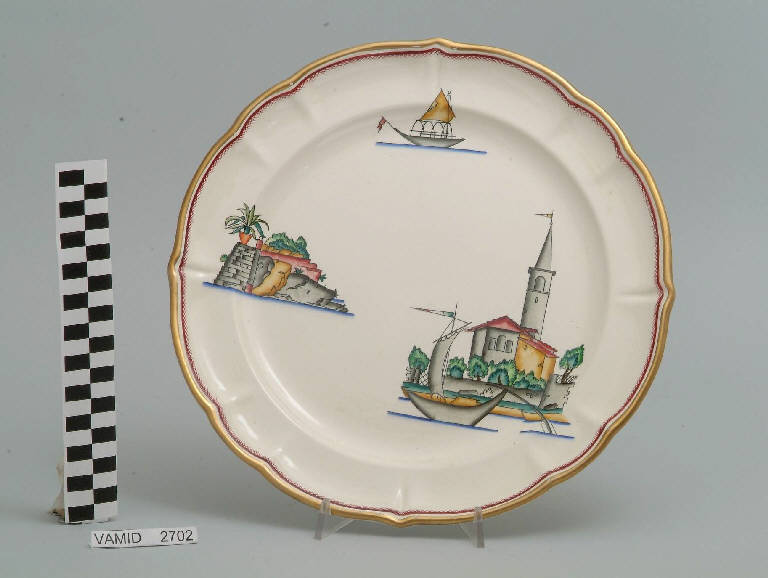 - NOTIZIE STORICO CRITICHE Il piatto da portata in esame fa parte del servizio forma "Vecchio Milano" con decoro "Lago Maggiore": vi sono raffigurati scorci del Lago Maggiore (una chiesa vicina alla riva del lago da identificarsi probabilmente con quella di Laveno-Mombello, una riva con attracco con cespugni e vaso) e un elemento caratteristico della vita sul lago (la tipica imbarcazione da pesca detta burchiello) rappresentati in un'atmosfera sospesa e silenziosa, seppur ridente nella resa stilizzata e nel fresco cromatismo delle raffigurazioni. Fin dalla sua nomina a direttore artistico della "S.C.I.", Guido Andlovitz si prefisse di rigenerare le forme tradizionali con decori nuovi. E' il caso della forma "Vecchio Milano" cui adattò nel 1931 il nuovissimo decoro "Lago Maggiore", a conferma che una decorazione nuova, se concepita organicamente, può conferire un aspetto attuale e "scattante" anche a una bella forma tradizionale. Fu certamente uno dei servizi più prestigiosi della produzione del momento se Andlovitz lo concepì in piccolissima serie e se l'azienda gli consentì - caso unico- di firmarlo nella marca. La scritta Verbano e la data 1931 presenti nel marchio suggeriscono che probabilmente il servizio fu realizzato per celebrare nel 1931 l'inizio della produzione di porcellana da tavola a Laveno nello stabilimento Verbano. Nell'ambito dei repertori decorativi creati dall'Andlovtz il decoro "Lago Maggiore" rappresenta un modo frazionato di raffigurare il paesaggio, definito da Mario Munari a "scena spezzata". L'impianto decorativo di queste ceramiche rifugge dalla centralità e dalla strutturazioni lungo diretrici ortogonali, mentre vi predominano l'asimmetria e le fughe visuali sghembe che risentono del gusto per la cineseria e il giapponismo. La semplificazione geometrica degli elementi e il modo di sfumare i corpi nel'intento di suggerirne la volumetria ricorda le opere di Carlo Carrà degli anni venti. Nel decoro "Lago Maggiore" sono presenti espressioni diversificate di un tema molto caro a Guido Andlovitz: i "paesaggi d'acqua" con particolare ricorrenza delle 'barche' raffigurate in una vasta gamma di tipi, generalmente riprese da modelli reali e con divertenti variazioni fantastiche. Il decoro Lago fu applicato in un primo momento sulla forma "Vecchio Milano", poi sulla forma "Pomezia" (1936 ca.). Del decoro Lago esistono diversi disegni originali a matita, pastello, inchiostro e acquerello su carta conservati nel fondo archivistico della "S.C.I.": alcuni di questi raffigurano il decoro proprio sulla forma "Vecchio Milano" con le rifiniture che compaiono sui pezzi finiti. Nel Museo è conservato anche un altro servizio forma "Vecchio Milano" con decoro "Lago Maggiore", ma più ridotto nella quantità e nella varietà dei componenti e con filettatura monocroma (num. inv. 2051...3517). Negli anni '90 la Richard Ginori ha rimesso in produzione il servizio Lago.\nIl servizio in esame è eseguito a colaggio, mentre i decori sono realizzati a decalcomania (o transfer): si vedano in proposito le lastre in rame acciaiato conservate nel Museo e raffiguranti molti dei decori presenti nel servizio in combinazioni diversificate (nn. inv. 2480, 2483, 2484, 2485). Tipologicamente si lega ad un servizio da caffé (num. inv. 2672...2900).\nIl piatto da portata è stato donato da Vanna Scotti Meregalli, nipote di Vanna Scotti, figlia dell'Ing. Luciano Scotti che fu direttore generale della "S.C.I." dal 1916.