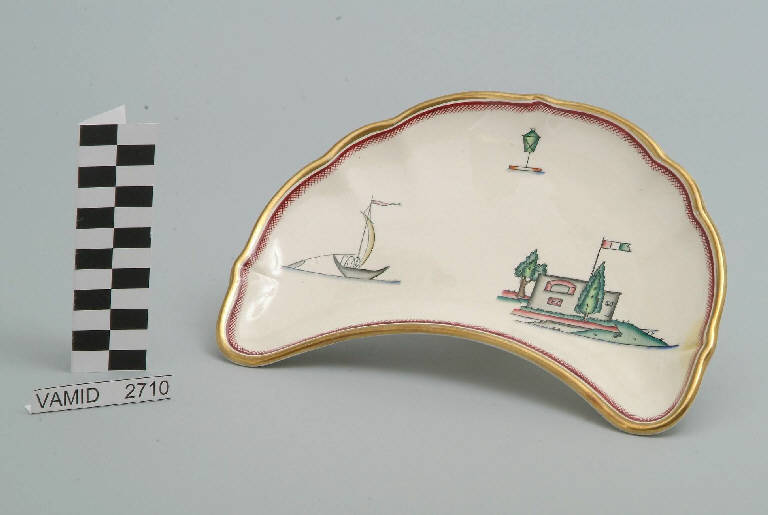 - NOTIZIE STORICO CRITICHE Il piatto lunetta in esame fa parte del servizio forma "Vecchio Milano" con decoro "Lago Maggiore": vi sono raffigurati uno scorcio del Lago Maggiore (un fortino sulla riva del lago con la bandiera italiana) ed elementi caratteristici della vita sul lago (una caratteristica imbarcazione da pesca, detta burchiello, in navigazione con la vela spiegata, e una boa luminosa) rappresentati in un'atmosfera sospesa e silenziosa, seppur ridente nella resa stilizzata e nel fresco cromatismo delle raffigurazioni. Fin dalla sua nomina a direttore artistico della "S.C.I.", Guido Andlovitz si prefisse di rigenerare le forme tradizionali con decori nuovi. E' il caso della forma "Vecchio Milano" cui adattò nel 1931 il nuovissimo decoro "Lago Maggiore", a conferma che una decorazione nuova, se concepita organicamente, può conferire un aspetto attuale e "scattante" anche a una bella forma tradizionale. Fu certamente uno dei servizi più prestigiosi della produzione del momento se Andlovitz lo concepì in piccolissima serie e se l'azienda gli consentì - caso unico- di firmarlo nella marca. La scritta Verbano e la data 1931 presenti nel marchio suggeriscono che probabilmente il servizio fu realizzato per celebrare nel 1931 l'inizio della produzione di porcellana da tavola a Laveno nello stabilimento Verbano. Nell'ambito dei repertori decorativi creati dall'Andlovtz il decoro "Lago Maggiore" rappresenta un modo frazionato di raffigurare il paesaggio, definito da Mario Munari a "scena spezzata". L'impianto decorativo di queste ceramiche rifugge dalla centralità e dalla strutturazioni lungo diretrici ortogonali, mentre vi predominano l'asimmetria e le fughe visuali sghembe che risentono del gusto per la cineseria e il giapponismo. La semplificazione geometrica degli elementi e il modo di sfumare i corpi nel'intento di suggerirne la volumetria ricorda le opere di Carlo Carrà degli anni venti. Nel decoro "Lago Maggiore" sono presenti espressioni diversificate di un tema molto caro a Guido Andlovitz: i "paesaggi d'acqua" con particolare ricorrenza delle 'barche' raffigurate in una vasta gamma di tipi, generalmente riprese da modelli reali e con divertenti variazioni fantastiche. Il decoro Lago fu applicato in un primo momento sulla forma "Vecchio Milano", poi sulla forma "Pomezia" (1936 ca.). Del decoro Lago esistono diversi disegni originali a matita, pastello, inchiostro e acquerello su carta conservati nel fondo archivistico della "S.C.I.": alcuni di questi raffigurano il decoro proprio sulla forma "Vecchio Milano" con le rifiniture che compaiono sui pezzi finiti. Nel Museo è conservato anche un altro servizio forma "Vecchio Milano" con decoro "Lago Maggiore", ma più ridotto nella quantità e nella varietà dei componenti e con filettatura monocroma (num. inv. 2051...3517). Negli anni '90 la Richard Ginori ha rimesso in produzione il servizio Lago.\nIl servizio in esame è eseguito a colaggio, mentre i decori sono realizzati a decalcomania (o transfer): si vedano in proposito le lastre in rame acciaiato conservate nel Museo e raffiguranti molti dei decori presenti nel servizio in combinazioni diversificate (nn. inv. 2480, 2483, 2484, 2485). Tipologicamente si lega ad un servizio da caffé (num. inv. 2672...2900).\nIl piatto lunetta è stato donato da Vanna Scotti Meregalli, nipote di Vanna Scotti, figlia dell'Ing. Luciano Scotti che fu direttore generale della "S.C.I." dal 1916.