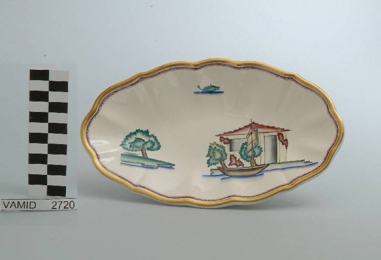 - NOTIZIE STORICO CRITICHE La raviera in esame fa parte del servizio forma "Vecchio Milano" con decoro "Lago Maggiore": vi sono raffigurati uno scorcio del Lago Maggiore (uno scoglio sistemato ad attracco con casa e barca a vela) ed elementi caratteristici della vita sul lago (un albero piegato dal vento e un pesce affiorante dall'acqua) rappresentati in un'atmosfera sospesa e silenziosa, seppur ridente nella resa stilizzata e nel fresco cromatismo delle raffigurazioni. Fin dalla sua nomina a direttore artistico della "S.C.I.", Guido Andlovitz si prefisse di rigenerare le forme tradizionali con decori nuovi. E' il caso della forma "Vecchio Milano" cui adattò nel 1931 il nuovissimo decoro "Lago Maggiore", a conferma che una decorazione nuova, se concepita organicamente, può conferire un aspetto attuale e "scattante" anche a una bella forma tradizionale. Fu certamente uno dei servizi più prestigiosi della produzione del momento se Andlovitz lo concepì in piccolissima serie e se l'azienda gli consentì - caso unico- di firmarlo nella marca. La scritta Verbano e la data 1931 presenti nel marchio suggeriscono che probabilmente il servizio fu realizzato per celebrare nel 1931 l'inizio della produzione di porcellana da tavola a Laveno nello stabilimento Verbano. Nell'ambito dei repertori decorativi creati dall'Andlovtz il decoro "Lago Maggiore" rappresenta un modo frazionato di raffigurare il paesaggio, definito da Mario Munari a "scena spezzata". L'impianto decorativo di queste ceramiche rifugge dalla centralità e dalla strutturazioni lungo diretrici ortogonali, mentre vi predominano l'asimmetria e le fughe visuali sghembe che risentono del gusto per la cineseria e il giapponismo. La semplificazione geometrica degli elementi e il modo di sfumare i corpi nel'intento di suggerirne la volumetria ricorda le opere di Carlo Carrà degli anni venti. Nel decoro "Lago Maggiore" sono presenti espressioni diversificate di un tema molto caro a Guido Andlovitz: i "paesaggi d'acqua" con particolare ricorrenza delle 'barche' raffigurate in una vasta gamma di tipi, generalmente riprese da modelli reali e con divertenti variazioni fantastiche. Il decoro Lago fu applicato in un primo momento sulla forma "Vecchio Milano", poi sulla forma "Pomezia" (1936 ca.). Del decoro Lago esistono diversi disegni originali a matita, pastello, inchiostro e acquerello su carta conservati nel fondo archivistico della "S.C.I.": alcuni di questi raffigurano il decoro proprio sulla forma "Vecchio Milano" con le rifiniture che compaiono sui pezzi finiti. Nel Museo è conservato anche un altro servizio forma "Vecchio Milano" con decoro "Lago Maggiore", ma più ridotto nella quantità e nella varietà dei componenti e con filettatura monocroma (num. inv. 2051...3517). Negli anni '90 la Richard Ginori ha rimesso in produzione il servizio Lago.\nIl servizio in esame è eseguito a colaggio, mentre i decori sono realizzati a decalcomania (o transfer): si vedano in proposito le lastre in rame acciaiato conservate nel Museo e raffiguranti molti dei decori presenti nel servizio in combinazioni diversificate (nn. inv. 2480, 2483, 2484, 2485). Tipologicamente si lega ad un servizio da caffé (num. inv. 2672...2900).\nLa raviera è stata donata da Vanna Scotti Meregalli, nipote di Vanna Scotti, figlia dell'Ing. Luciano Scotti che fu direttore generale della "S.C.I." dal 1916.
