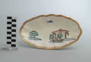 Raviera di forma ovale con fondo leggeremente concavo e l'orlo ondulato. Il fondo è bianco mentre i decori sono a smalti policromi e sono collocati ai due lati e al centro in alto. L'orlo è dorato e rifinito da una piccola fascia smaltata a tratteggio incrociato in rosso.