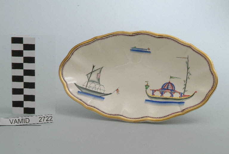 - NOTIZIE STORICO CRITICHE La raviera in esame fa parte del servizio forma "Vecchio Milano" con decoro "Lago Maggiore": vi sono raffigurati tre tipi di diverse imbarcazioni presenti nel Lago Maggiore (la tipica barca da pesca detta burchiello, un motoscafo e una gondola da parata utilizzata in occasione di festeggiamenti e ricorrenze), rappresentate in un'atmosfera sospesa e silenziosa, seppur ridente nella resa stilizzata e nel fresco cromatismo delle raffigurazioni. Fin dalla sua nomina a direttore artistico della "S.C.I.", Guido Andlovitz si prefisse di rigenerare le forme tradizionali con decori nuovi. E' il caso della forma "Vecchio Milano" cui adattò nel 1931 il nuovissimo decoro "Lago Maggiore", a conferma che una decorazione nuova, se concepita organicamente, può conferire un aspetto attuale e "scattante" anche a una bella forma tradizionale. Fu certamente uno dei servizi più prestigiosi della produzione del momento se Andlovitz lo concepì in piccolissima serie e se l'azienda gli consentì - caso unico- di firmarlo nella marca. La scritta Verbano e la data 1931 presenti nel marchio suggeriscono che probabilmente il servizio fu realizzato per celebrare nel 1931 l'inizio della produzione di porcellana da tavola a Laveno nello stabilimento Verbano. Nell'ambito dei repertori decorativi creati dall'Andlovtz il decoro "Lago Maggiore" rappresenta un modo frazionato di raffigurare il paesaggio, definito da Mario Munari a "scena spezzata". L'impianto decorativo di queste ceramiche rifugge dalla centralità e dalla strutturazioni lungo diretrici ortogonali, mentre vi predominano l'asimmetria e le fughe visuali sghembe che risentono del gusto per la cineseria e il giapponismo. La semplificazione geometrica degli elementi e il modo di sfumare i corpi nel'intento di suggerirne la volumetria ricorda le opere di Carlo Carrà degli anni venti. Nel decoro "Lago Maggiore" sono presenti espressioni diversificate di un tema molto caro a Guido Andlovitz: i "paesaggi d'acqua" con particolare ricorrenza delle 'barche' raffigurate in una vasta gamma di tipi, generalmente riprese da modelli reali e con divertenti variazioni fantastiche. Il decoro Lago fu applicato in un primo momento sulla forma "Vecchio Milano", poi sulla forma "Pomezia" (1936 ca.). Del decoro Lago esistono diversi disegni originali a matita, pastello, inchiostro e acquerello su carta conservati nel fondo archivistico della "S.C.I.": alcuni di questi raffigurano il decoro proprio sulla forma "Vecchio Milano" con le rifiniture che compaiono sui pezzi finiti. Nel Museo è conservato anche un altro servizio forma "Vecchio Milano" con decoro "Lago Maggiore", ma più ridotto nella quantità e nella varietà dei componenti e con filettatura monocroma (num. inv. 2051...3517). Negli anni '90 la Richard Ginori ha rimesso in produzione il servizio Lago.\nIl servizio in esame è eseguito a colaggio, mentre i decori sono realizzati a decalcomania (o transfer): si vedano in proposito le lastre in rame acciaiato conservate nel Museo e raffiguranti molti dei decori presenti nel servizio in combinazioni diversificate (nn. inv. 2480, 2483, 2484, 2485). Tipologicamente si lega ad un servizio da caffé (num. inv. 2672...2900).\nLa raviera è stata donata da Vanna Scotti Meregalli, nipote di Vanna Scotti, figlia dell'Ing. Luciano Scotti che fu direttore generale della "S.C.I." dal 1916.