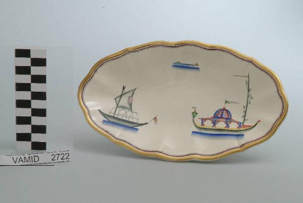 Raviera di forma ovale con fondo leggeremente concavo e l'orlo ondulato. Il fondo è bianco mentre i decori sono a smalti policromi e sono collocati ai due lati e al centro in alto. L'orlo è dorato e rifinito da una piccola fascia smaltata a tratteggio incrociato in rosso.