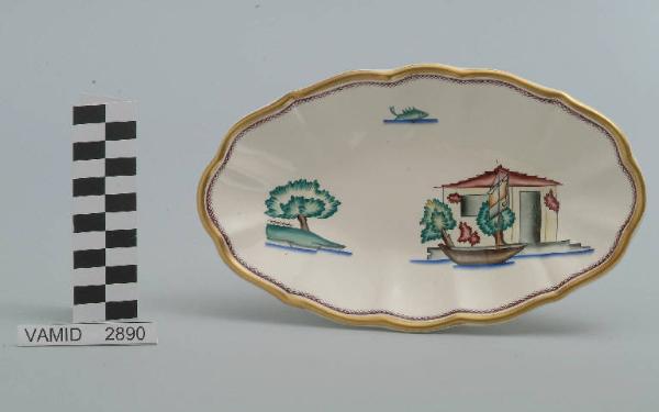 - NOTIZIE STORICO CRITICHE La raviera in esame fa parte del servizio forma "Vecchio Milano" con decoro "Lago Maggiore": vi sono raffigurati uno scorcio del Lago Maggiore (uno scoglio sistemato ad attracco con casa e barca a vela) ed elementi caratteristici della vita sul lago (un albero piegato dal vento e un pesce affiorante dall'acqua) rappresentati in un'atmosfera sospesa e silenziosa, seppur ridente nella resa stilizzata e nel fresco cromatismo delle raffigurazioni. Fin dalla sua nomina a direttore artistico della "S.C.I.", Guido Andlovitz si prefisse di rigenerare le forme tradizionali con decori nuovi. E' il caso della forma "Vecchio Milano" cui adattò nel 1931 il nuovissimo decoro "Lago Maggiore", a conferma che una decorazione nuova, se concepita organicamente, può conferire un aspetto attuale e "scattante" anche a una bella forma tradizionale. Fu certamente uno dei servizi più prestigiosi della produzione del momento se Andlovitz lo concepì in piccolissima serie e se l'azienda gli consentì - caso unico- di firmarlo nella marca. La scritta Verbano e la data 1931 presenti nel marchio suggeriscono che probabilmente il servizio fu realizzato per celebrare nel 1931 l'inizio della produzione di porcellana da tavola a Laveno nello stabilimento Verbano. Nell'ambito dei repertori decorativi creati dall'Andlovtz il decoro "Lago Maggiore" rappresenta un modo frazionato di raffigurare il paesaggio, definito da Mario Munari a "scena spezzata". L'impianto decorativo di queste ceramiche rifugge dalla centralità e dalla strutturazioni lungo diretrici ortogonali, mentre vi predominano l'asimmetria e le fughe visuali sghembe che risentono del gusto per la cineseria e il giapponismo. La semplificazione geometrica degli elementi e il modo di sfumare i corpi nel'intento di suggerirne la volumetria ricorda le opere di Carlo Carrà degli anni venti. Nel decoro "Lago Maggiore" sono presenti espressioni diversificate di un tema molto caro a Guido Andlovitz: i "paesaggi d'acqua" con particolare ricorrenza delle 'barche' raffigurate in una vasta gamma di tipi, generalmente riprese da modelli reali e con divertenti variazioni fantastiche. Il decoro Lago fu applicato in un primo momento sulla forma "Vecchio Milano", poi sulla forma "Pomezia" (1936 ca.). Del decoro Lago esistono diversi disegni originali a matita, pastello, inchiostro e acquerello su carta conservati nel fondo archivistico della "S.C.I.": alcuni di questi raffigurano il decoro proprio sulla forma "Vecchio Milano" con le rifiniture che compaiono sui pezzi finiti. Nel Museo è conservato anche un altro servizio forma "Vecchio Milano" con decoro "Lago Maggiore", ma più ridotto nella quantità e nella varietà dei componenti e con filettatura monocroma (num. inv. 2051...3517). Negli anni '90 la Richard Ginori ha rimesso in produzione il servizio Lago.\nIl servizio in esame è eseguito a colaggio, mentre i decori sono realizzati a decalcomania (o transfer): si vedano in proposito le lastre in rame acciaiato conservate nel Museo e raffiguranti molti dei decori presenti nel servizio in combinazioni diversificate (nn. inv. 2480, 2483, 2484, 2485). Tipologicamente si lega ad un servizio da caffé (num. inv. 2672...2900).\nLa raviera è stata donata da Vanna Scotti Meregalli, nipote di Vanna Scotti, figlia dell'Ing. Luciano Scotti che fu direttore generale della "S.C.I." dal 1916.