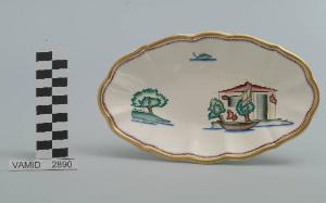 Raviera di forma ovale con fondo leggeremente concavo e l'orlo ondulato. Il fondo è bianco mentre i decori sono a smalti policromi e sono collocati ai due lati e al centro in alto. L'orlo è dorato e rifinito da una piccola fascia smaltata a tratteggio incrociato in rosso.