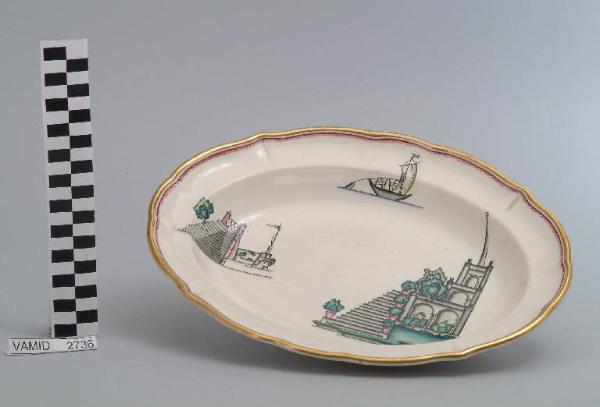 Piatto fondo da portata di forma ovale avente la tesa leggermente sagomata e l'orlo ondulato. Il fondo è bianco mentre i decori sono a smalti policromi e sono distribuiti liberamente sul fondo del piatto e sulla tesa. L'orlo è dorato e rifinito da una piccola fascia smaltata a tratteggio incrociato in rosso.
