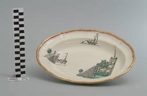 - NOTIZIE STORICO CRITICHE Il piatto da portata ovale in esame fa parte del servizio forma "Vecchio Milano" con decoro "Lago Maggiore": vi sono raffigurati uno scorcio del Lago Maggiore (una veduta laterale del ninfeo del palazzo Borromeo nell'Isola Bella) ed elementi caratteristici della vita sul lago (un approdo con scaletta e moletto, una barca da pesca tipica, detta burchiello) rappresentati in un'atmosfera sospesa e silenziosa, seppur ridente nella resa stilizzata e nel fresco cromatismo delle raffigurazioni. Fin dalla sua nomina a direttore artistico della "S.C.I.", Guido Andlovitz si prefisse di rigenerare le forme tradizionali con decori nuovi. E' il caso della forma "Vecchio Milano" cui adattò nel 1931 il nuovissimo decoro "Lago Maggiore", a conferma che una decorazione nuova, se concepita organicamente, può conferire un aspetto attuale e "scattante" anche a una bella forma tradizionale. Fu certamente uno dei servizi più prestigiosi della produzione del momento se Andlovitz lo concepì in piccolissima serie e se l'azienda gli consentì - caso unico- di firmarlo nella marca. La scritta Verbano e la data 1931 presenti nel marchio suggeriscono che probabilmente il servizio fu realizzato per celebrare nel 1931 l'inizio della produzione di porcellana da tavola a Laveno nello stabilimento Verbano. Nell'ambito dei repertori decorativi creati dall'Andlovtz il decoro "Lago Maggiore" rappresenta un modo frazionato di raffigurare il paesaggio, definito da Mario Munari a "scena spezzata". L'impianto decorativo di queste ceramiche rifugge dalla centralità e dalla strutturazioni lungo diretrici ortogonali, mentre vi predominano l'asimmetria e le fughe visuali sghembe che risentono del gusto per la cineseria e il giapponismo. La semplificazione geometrica degli elementi e il modo di sfumare i corpi nel'intento di suggerirne la volumetria ricorda le opere di Carlo Carrà degli anni venti. Nel decoro "Lago Maggiore" sono presenti espressioni diversificate di un tema molto caro a Guido Andlovitz: i "paesaggi d'acqua" con particolare ricorrenza delle 'barche' raffigurate in una vasta gamma di tipi, generalmente riprese da modelli reali e con divertenti variazioni fantastiche. Il decoro Lago fu applicato in un primo momento sulla forma "Vecchio Milano", poi sulla forma "Pomezia" (1936 ca.). Del decoro Lago esistono diversi disegni originali a matita, pastello, inchiostro e acquerello su carta conservati nel fondo archivistico della "S.C.I.": alcuni di questi raffigurano il decoro proprio sulla forma "Vecchio Milano" con le rifiniture che compaiono sui pezzi finiti. Nel Museo è conservato anche un altro servizio forma "Vecchio Milano" con decoro "Lago Maggiore", ma più ridotto nella quantità e nella varietà dei componenti e con filettatura monocroma (num. inv. 2051...3517). Negli anni '90 la Richard Ginori ha rimesso in produzione il servizio Lago.\nIl servizio in esame è eseguito a colaggio, mentre i decori sono realizzati a decalcomania (o transfer): si vedano in proposito le lastre in rame acciaiato conservate nel Museo e raffiguranti molti dei decori presenti nel servizio in combinazioni diversificate (nn. inv. 2480, 2483, 2484, 2485). Tipologicamente si lega ad un servizio da caffé (num. inv. 2672...2900).\nIl piatto da portata è stato donato da Vanna Scotti Meregalli, nipote di Vanna Scotti, figlia dell'Ing. Luciano Scotti che fu direttore generale della "S.C.I." dal 1916.