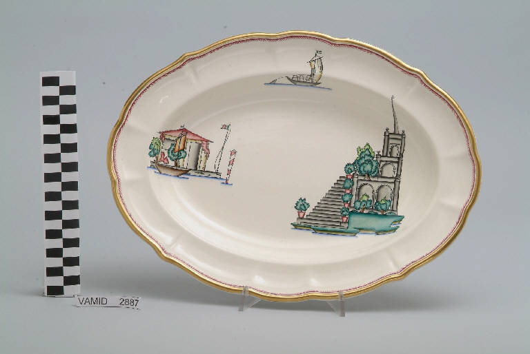 - NOTIZIE STORICO CRITICHE Il piatto da portata ovale in esame fa parte del servizio forma "Vecchio Milano" con decoro "Lago Maggiore": vi sono raffigurati uno scorcio del Lago Maggiore (una veduta laterale del ninfeo del palazzo Borromeo nell'Isola Bella) ed elementi caratteristici della vita sul lago (uno scoglio con piccolo edificio e una barca a vela in avvicinamento, un'altra barca da pesca tipica, detta burchiello) rappresentati in un'atmosfera sospesa e silenziosa, seppur ridente nella resa stilizzata e nel fresco cromatismo delle raffigurazioni. Fin dalla sua nomina a direttore artistico della "S.C.I.", Guido Andlovitz si prefisse di rigenerare le forme tradizionali con decori nuovi. E' il caso della forma "Vecchio Milano" cui adattò nel 1931 il nuovissimo decoro "Lago Maggiore", a conferma che una decorazione nuova, se concepita organicamente, può conferire un aspetto attuale e "scattante" anche a una bella forma tradizionale. Fu certamente uno dei servizi più prestigiosi della produzione del momento se Andlovitz lo concepì in piccolissima serie e se l'azienda gli consentì - caso unico- di firmarlo nella marca. La scritta Verbano e la data 1931 presenti nel marchio suggeriscono che probabilmente il servizio fu realizzato per celebrare nel 1931 l'inizio della produzione di porcellana da tavola a Laveno nello stabilimento Verbano. Nell'ambito dei repertori decorativi creati dall'Andlovtz il decoro "Lago Maggiore" rappresenta un modo frazionato di raffigurare il paesaggio, definito da Mario Munari a "scena spezzata". L'impianto decorativo di queste ceramiche rifugge dalla centralità e dalla strutturazioni lungo diretrici ortogonali, mentre vi predominano l'asimmetria e le fughe visuali sghembe che risentono del gusto per la cineseria e il giapponismo. La semplificazione geometrica degli elementi e il modo di sfumare i corpi nel'intento di suggerirne la volumetria ricorda le opere di Carlo Carrà degli anni venti. Nel decoro "Lago Maggiore" sono presenti espressioni diversificate di un tema molto caro a Guido Andlovitz: i "paesaggi d'acqua" con particolare ricorrenza delle 'barche' raffigurate in una vasta gamma di tipi, generalmente riprese da modelli reali e con divertenti variazioni fantastiche. Il decoro Lago fu applicato in un primo momento sulla forma "Vecchio Milano", poi sulla forma "Pomezia" (1936 ca.). Del decoro Lago esistono diversi disegni originali a matita, pastello, inchiostro e acquerello su carta conservati nel fondo archivistico della "S.C.I.": alcuni di questi raffigurano il decoro proprio sulla forma "Vecchio Milano" con le rifiniture che compaiono sui pezzi finiti. Nel Museo è conservato anche un altro servizio forma "Vecchio Milano" con decoro "Lago Maggiore", ma più ridotto nella quantità e nella varietà dei componenti e con filettatura monocroma (num. inv. 2051...3517). Negli anni '90 la Richard Ginori ha rimesso in produzione il servizio Lago.\nIl servizio in esame è eseguito a colaggio, mentre i decori sono realizzati a decalcomania (o transfer): si vedano in proposito le lastre in rame acciaiato conservate nel Museo e raffiguranti molti dei decori presenti nel servizio in combinazioni diversificate (nn. inv. 2480, 2483, 2484, 2485). Tipologicamente si lega ad un servizio da caffé (num. inv. 2672...2900).\nIl piatto da portata è stato donato da Vanna Scotti Meregalli, nipote di Vanna Scotti, figlia dell'Ing. Luciano Scotti che fu direttore generale della "S.C.I." dal 1916.