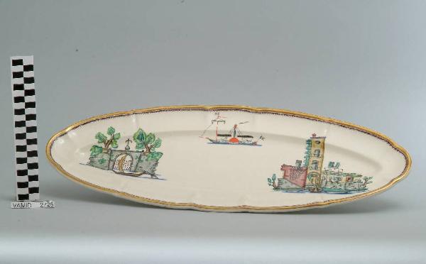 - NOTIZIE STORICO CRITICHE Il piatto da portata per pesce in esame fa parte del servizio forma "Vecchio Milano" con decoro "Lago Maggiore": vi sono raffigurati scorci del Lago Maggiore (una riva con una casa di pescatori con finestre aperte e reti ad asciugare e l'ingresso di un porticciolo privato chiuso da un cancello) e un elemento caratteristici della vita sul lago (un battello a vapore con tende per il sole) rappresentati in un'atmosfera sospesa e silenziosa, seppur ridente nella resa stilizzata e nel fresco cromatismo delle raffigurazioni. Fin dalla sua nomina a direttore artistico della "S.C.I.", Guido Andlovitz si prefisse di rigenerare le forme tradizionali con decori nuovi. E' il caso della forma "Vecchio Milano" cui adattò nel 1931 il nuovissimo decoro "Lago Maggiore", a conferma che una decorazione nuova, se concepita organicamente, può conferire un aspetto attuale e "scattante" anche a una bella forma tradizionale. Fu certamente uno dei servizi più prestigiosi della produzione del momento se Andlovitz lo concepì in piccolissima serie e se l'azienda gli consentì - caso unico- di firmarlo nella marca. La scritta Verbano e la data 1931 presenti nel marchio suggeriscono che probabilmente il servizio fu realizzato per celebrare nel 1931 l'inizio della produzione di porcellana da tavola a Laveno nello stabilimento Verbano. Nell'ambito dei repertori decorativi creati dall'Andlovtz il decoro "Lago Maggiore" rappresenta un modo frazionato di raffigurare il paesaggio, definito da Mario Munari a "scena spezzata". L'impianto decorativo di queste ceramiche rifugge dalla centralità e dalla strutturazioni lungo diretrici ortogonali, mentre vi predominano l'asimmetria e le fughe visuali sghembe che risentono del gusto per la cineseria e il giapponismo. La semplificazione geometrica degli elementi e il modo di sfumare i corpi nel'intento di suggerirne la volumetria ricorda le opere di Carlo Carrà degli anni venti. Nel decoro "Lago Maggiore" sono presenti espressioni diversificate di un tema molto caro a Guido Andlovitz: i "paesaggi d'acqua" con particolare ricorrenza delle 'barche' raffigurate in una vasta gamma di tipi, generalmente riprese da modelli reali e con divertenti variazioni fantastiche. Il decoro Lago fu applicato in un primo momento sulla forma "Vecchio Milano", poi sulla forma "Pomezia" (1936 ca.). Del decoro Lago esistono diversi disegni originali a matita, pastello, inchiostro e acquerello su carta conservati nel fondo archivistico della "S.C.I.": alcuni di questi raffigurano il decoro proprio sulla forma "Vecchio Milano" con le rifiniture che compaiono sui pezzi finiti. Nel Museo è conservato anche un altro servizio forma "Vecchio Milano" con decoro "Lago Maggiore", ma più ridotto nella quantità e nella varietà dei componenti e con filettatura monocroma (num. inv. 2051...3517). Negli anni '90 la Richard Ginori ha rimesso in produzione il servizio Lago.\nIl servizio in esame è eseguito a colaggio, mentre i decori sono realizzati a decalcomania (o transfer): si vedano in proposito le lastre in rame acciaiato conservate nel Museo e raffiguranti molti dei decori presenti nel servizio in combinazioni diversificate (nn. inv. 2480, 2483, 2484, 2485). Tipologicamente si lega ad un servizio da caffé (num. inv. 2672...2900).\nIl piatto da portata è stato donato da Vanna Scotti Meregalli, nipote di Vanna Scotti, figlia dell'Ing. Luciano Scotti che fu direttore generale della "S.C.I." dal 1916.