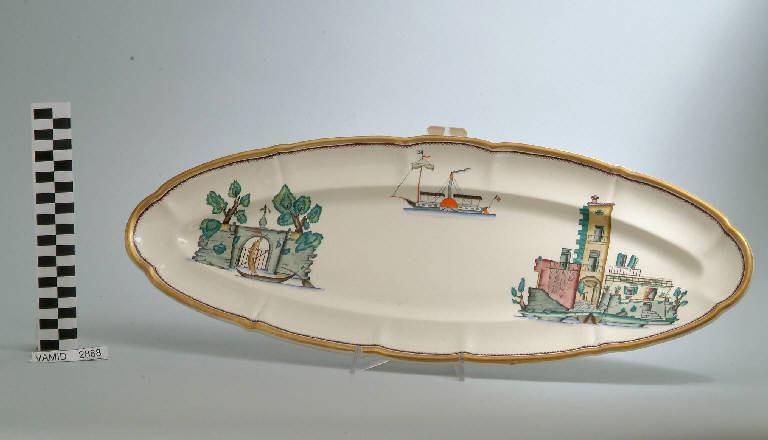 - NOTIZIE STORICO CRITICHE Il piatto da portata per pesce in esame fa parte del servizio forma "Vecchio Milano" con decoro "Lago Maggiore": vi sono raffigurati scorci del Lago Maggiore (una riva con una casa di pescatori con finestre aperte e reti ad asciugare e l'ingresso di un porticciolo privato chiuso da un cancello) e un elemento caratteristici della vita sul lago (un battello a vapore con tende per il sole) rappresentati in un'atmosfera sospesa e silenziosa, seppur ridente nella resa stilizzata e nel fresco cromatismo delle raffigurazioni. Fin dalla sua nomina a direttore artistico della "S.C.I.", Guido Andlovitz si prefisse di rigenerare le forme tradizionali con decori nuovi. E' il caso della forma "Vecchio Milano" cui adattò nel 1931 il nuovissimo decoro "Lago Maggiore", a conferma che una decorazione nuova, se concepita organicamente, può conferire un aspetto attuale e "scattante" anche a una bella forma tradizionale. Fu certamente uno dei servizi più prestigiosi della produzione del momento se Andlovitz lo concepì in piccolissima serie e se l'azienda gli consentì - caso unico- di firmarlo nella marca. La scritta Verbano e la data 1931 presenti nel marchio suggeriscono che probabilmente il servizio fu realizzato per celebrare nel 1931 l'inizio della produzione di porcellana da tavola a Laveno nello stabilimento Verbano. Nell'ambito dei repertori decorativi creati dall'Andlovtz il decoro "Lago Maggiore" rappresenta un modo frazionato di raffigurare il paesaggio, definito da Mario Munari a "scena spezzata". L'impianto decorativo di queste ceramiche rifugge dalla centralità e dalla strutturazioni lungo diretrici ortogonali, mentre vi predominano l'asimmetria e le fughe visuali sghembe che risentono del gusto per la cineseria e il giapponismo. La semplificazione geometrica degli elementi e il modo di sfumare i corpi nel'intento di suggerirne la volumetria ricorda le opere di Carlo Carrà degli anni venti. Nel decoro "Lago Maggiore" sono presenti espressioni diversificate di un tema molto caro a Guido Andlovitz: i "paesaggi d'acqua" con particolare ricorrenza delle 'barche' raffigurate in una vasta gamma di tipi, generalmente riprese da modelli reali e con divertenti variazioni fantastiche. Il decoro Lago fu applicato in un primo momento sulla forma "Vecchio Milano", poi sulla forma "Pomezia" (1936 ca.). Del decoro Lago esistono diversi disegni originali a matita, pastello, inchiostro e acquerello su carta conservati nel fondo archivistico della "S.C.I.": alcuni di questi raffigurano il decoro proprio sulla forma "Vecchio Milano" con le rifiniture che compaiono sui pezzi finiti. Nel Museo è conservato anche un altro servizio forma "Vecchio Milano" con decoro "Lago Maggiore", ma più ridotto nella quantità e nella varietà dei componenti e con filettatura monocroma (num. inv. 2051...3517). Negli anni '90 la Richard Ginori ha rimesso in produzione il servizio Lago.\nIl servizio in esame è eseguito a colaggio, mentre i decori sono realizzati a decalcomania (o transfer): si vedano in proposito le lastre in rame acciaiato conservate nel Museo e raffiguranti molti dei decori presenti nel servizio in combinazioni diversificate (nn. inv. 2480, 2483, 2484, 2485). Tipologicamente si lega ad un servizio da caffé (num. inv. 2672...2900).\nIl piatto da portata è stato donato da Vanna Scotti Meregalli, nipote di Vanna Scotti, figlia dell'Ing. Luciano Scotti che fu direttore generale della "S.C.I." dal 1916.