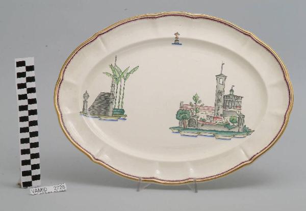 - NOTIZIE STORICO CRITICHE Il piatto da portata ovale in esame fa parte del servizio forma "Vecchio Milano" con decoro "Lago Maggiore": vi sono raffigurati uno scorcio del Lago Maggiore (la veduta laterale della chiesa della Madonna di Campagna a Verbania con il suo tiburio ottagonale cinquecentesco e il campanile romanico) ed elementi caratteristici della vita sul lago (un approdo di una delle tante ville che si affacciano sul lago, con pennone, vaso decorativo in pietra e palmizi, e un altro vaso decorativo similare) rappresentati in un'atmosfera sospesa e silenziosa, seppur ridente nella resa stilizzata e nel fresco cromatismo delle raffigurazioni. Fin dalla sua nomina a direttore artistico della "S.C.I.", Guido Andlovitz si prefisse di rigenerare le forme tradizionali con decori nuovi. E' il caso della forma "Vecchio Milano" cui adattò nel 1931 il nuovissimo decoro "Lago Maggiore", a conferma che una decorazione nuova, se concepita organicamente, può conferire un aspetto attuale e "scattante" anche a una bella forma tradizionale. Fu certamente uno dei servizi più prestigiosi della produzione del momento se Andlovitz lo concepì in piccolissima serie e se l'azienda gli consentì - caso unico- di firmarlo nella marca. La scritta Verbano e la data 1931 presenti nel marchio suggeriscono che probabilmente il servizio fu realizzato per celebrare nel 1931 l'inizio della produzione di porcellana da tavola a Laveno nello stabilimento Verbano. Nell'ambito dei repertori decorativi creati dall'Andlovtz il decoro "Lago Maggiore" rappresenta un modo frazionato di raffigurare il paesaggio, definito da Mario Munari a "scena spezzata". L'impianto decorativo di queste ceramiche rifugge dalla centralità e dalla strutturazioni lungo diretrici ortogonali, mentre vi predominano l'asimmetria e le fughe visuali sghembe che risentono del gusto per la cineseria e il giapponismo. La semplificazione geometrica degli elementi e il modo di sfumare i corpi nel'intento di suggerirne la volumetria ricorda le opere di Carlo Carrà degli anni venti. Nel decoro "Lago Maggiore" sono presenti espressioni diversificate di un tema molto caro a Guido Andlovitz: i "paesaggi d'acqua" con particolare ricorrenza delle 'barche' raffigurate in una vasta gamma di tipi, generalmente riprese da modelli reali e con divertenti variazioni fantastiche. Il decoro Lago fu applicato in un primo momento sulla forma "Vecchio Milano", poi sulla forma "Pomezia" (1936 ca.). Del decoro Lago esistono diversi disegni originali a matita, pastello, inchiostro e acquerello su carta conservati nel fondo archivistico della "S.C.I.": alcuni di questi raffigurano il decoro proprio sulla forma "Vecchio Milano" con le rifiniture che compaiono sui pezzi finiti. Nel Museo è conservato anche un altro servizio forma "Vecchio Milano" con decoro "Lago Maggiore", ma più ridotto nella quantità e nella varietà dei componenti e con filettatura monocroma (num. inv. 2051...3517). Negli anni '90 la Richard Ginori ha rimesso in produzione il servizio Lago.\nIl servizio in esame è eseguito a colaggio, mentre i decori sono realizzati a decalcomania (o transfer): si vedano in proposito le lastre in rame acciaiato conservate nel Museo e raffiguranti molti dei decori presenti nel servizio in combinazioni diversificate (nn. inv. 2480, 2483, 2484, 2485). Tipologicamente si lega ad un servizio da caffé (num. inv. 2672...2900).\nIl piatto da portata è stato donato da Vanna Scotti Meregalli, nipote di Vanna Scotti, figlia dell'Ing. Luciano Scotti che fu direttore generale della "S.C.I." dal 1916.