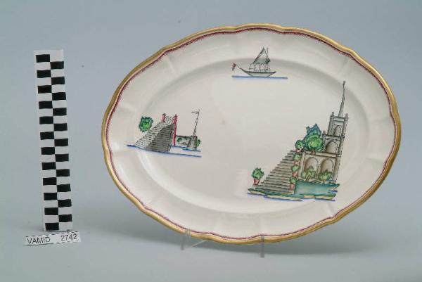 - NOTIZIE STORICO CRITICHE Il piatto da portata ovale in esame fa parte del servizio forma "Vecchio Milano" con decoro "Lago Maggiore": vi sono raffigurati uno scorcio del Lago Maggiore (una veduta laterale del ninfeo del palazzo Borromeo nell'Isola Bella) ed elementi caratteristici della vita sul lago (un attracco con scaletta e molo e una barca da pesca tipica, detta burchiello) rappresentati in un'atmosfera sospesa e silenziosa, seppur ridente nella resa stilizzata e nel fresco cromatismo delle raffigurazioni. Fin dalla sua nomina a direttore artistico della "S.C.I.", Guido Andlovitz si prefisse di rigenerare le forme tradizionali con decori nuovi. E' il caso della forma "Vecchio Milano" cui adattò nel 1931 il nuovissimo decoro "Lago Maggiore", a conferma che una decorazione nuova, se concepita organicamente, può conferire un aspetto attuale e "scattante" anche a una bella forma tradizionale. Fu certamente uno dei servizi più prestigiosi della produzione del momento se Andlovitz lo concepì in piccolissima serie e se l'azienda gli consentì - caso unico- di firmarlo nella marca. La scritta Verbano e la data 1931 presenti nel marchio suggeriscono che probabilmente il servizio fu realizzato per celebrare nel 1931 l'inizio della produzione di porcellana da tavola a Laveno nello stabilimento Verbano. Nell'ambito dei repertori decorativi creati dall'Andlovtz il decoro "Lago Maggiore" rappresenta un modo frazionato di raffigurare il paesaggio, definito da Mario Munari a "scena spezzata". L'impianto decorativo di queste ceramiche rifugge dalla centralità e dalla strutturazioni lungo diretrici ortogonali, mentre vi predominano l'asimmetria e le fughe visuali sghembe che risentono del gusto per la cineseria e il giapponismo. La semplificazione geometrica degli elementi e il modo di sfumare i corpi nel'intento di suggerirne la volumetria ricorda le opere di Carlo Carrà degli anni venti. Nel decoro "Lago Maggiore" sono presenti espressioni diversificate di un tema molto caro a Guido Andlovitz: i "paesaggi d'acqua" con particolare ricorrenza delle 'barche' raffigurate in una vasta gamma di tipi, generalmente riprese da modelli reali e con divertenti variazioni fantastiche. Il decoro Lago fu applicato in un primo momento sulla forma "Vecchio Milano", poi sulla forma "Pomezia" (1936 ca.). Del decoro Lago esistono diversi disegni originali a matita, pastello, inchiostro e acquerello su carta conservati nel fondo archivistico della "S.C.I.": alcuni di questi raffigurano il decoro proprio sulla forma "Vecchio Milano" con le rifiniture che compaiono sui pezzi finiti. Nel Museo è conservato anche un altro servizio forma "Vecchio Milano" con decoro "Lago Maggiore", ma più ridotto nella quantità e nella varietà dei componenti e con filettatura monocroma (num. inv. 2051...3517). Negli anni '90 la Richard Ginori ha rimesso in produzione il servizio Lago.\nIl servizio in esame è eseguito a colaggio, mentre i decori sono realizzati a decalcomania (o transfer): si vedano in proposito le lastre in rame acciaiato conservate nel Museo e raffiguranti molti dei decori presenti nel servizio in combinazioni diversificate (nn. inv. 2480, 2483, 2484, 2485). Tipologicamente si lega ad un servizio da caffé (num. inv. 2672...2900).\nIl piatto da portata è stato donato da Vanna Scotti Meregalli, nipote di Vanna Scotti, figlia dell'Ing. Luciano Scotti che fu direttore generale della "S.C.I." dal 1916.