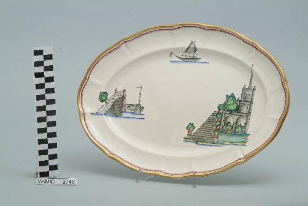 - NOTIZIE STORICO CRITICHE Il piatto da portata ovale in esame fa parte del servizio forma "Vecchio Milano" con decoro "Lago Maggiore": vi sono raffigurati uno scorcio del Lago Maggiore (una veduta laterale del ninfeo del palazzo Borromeo nell'Isola Bella) ed elementi caratteristici della vita sul lago (un attracco con scaletta e molo e una barca da pesca tipica, detta burchiello) rappresentati in un'atmosfera sospesa e silenziosa, seppur ridente nella resa stilizzata e nel fresco cromatismo delle raffigurazioni. Fin dalla sua nomina a direttore artistico della "S.C.I.", Guido Andlovitz si prefisse di rigenerare le forme tradizionali con decori nuovi. E' il caso della forma "Vecchio Milano" cui adattò nel 1931 il nuovissimo decoro "Lago Maggiore", a conferma che una decorazione nuova, se concepita organicamente, può conferire un aspetto attuale e "scattante" anche a una bella forma tradizionale. Fu certamente uno dei servizi più prestigiosi della produzione del momento se Andlovitz lo concepì in piccolissima serie e se l'azienda gli consentì - caso unico- di firmarlo nella marca. La scritta Verbano e la data 1931 presenti nel marchio suggeriscono che probabilmente il servizio fu realizzato per celebrare nel 1931 l'inizio della produzione di porcellana da tavola a Laveno nello stabilimento Verbano. Nell'ambito dei repertori decorativi creati dall'Andlovtz il decoro "Lago Maggiore" rappresenta un modo frazionato di raffigurare il paesaggio, definito da Mario Munari a "scena spezzata". L'impianto decorativo di queste ceramiche rifugge dalla centralità e dalla strutturazioni lungo diretrici ortogonali, mentre vi predominano l'asimmetria e le fughe visuali sghembe che risentono del gusto per la cineseria e il giapponismo. La semplificazione geometrica degli elementi e il modo di sfumare i corpi nel'intento di suggerirne la volumetria ricorda le opere di Carlo Carrà degli anni venti. Nel decoro "Lago Maggiore" sono presenti espressioni diversificate di un tema molto caro a Guido Andlovitz: i "paesaggi d'acqua" con particolare ricorrenza delle 'barche' raffigurate in una vasta gamma di tipi, generalmente riprese da modelli reali e con divertenti variazioni fantastiche. Il decoro Lago fu applicato in un primo momento sulla forma "Vecchio Milano", poi sulla forma "Pomezia" (1936 ca.). Del decoro Lago esistono diversi disegni originali a matita, pastello, inchiostro e acquerello su carta conservati nel fondo archivistico della "S.C.I.": alcuni di questi raffigurano il decoro proprio sulla forma "Vecchio Milano" con le rifiniture che compaiono sui pezzi finiti. Nel Museo è conservato anche un altro servizio forma "Vecchio Milano" con decoro "Lago Maggiore", ma più ridotto nella quantità e nella varietà dei componenti e con filettatura monocroma (num. inv. 2051...3517). Negli anni '90 la Richard Ginori ha rimesso in produzione il servizio Lago.\nIl servizio in esame è eseguito a colaggio, mentre i decori sono realizzati a decalcomania (o transfer): si vedano in proposito le lastre in rame acciaiato conservate nel Museo e raffiguranti molti dei decori presenti nel servizio in combinazioni diversificate (nn. inv. 2480, 2483, 2484, 2485). Tipologicamente si lega ad un servizio da caffé (num. inv. 2672...2900).\nIl piatto da portata è stato donato da Vanna Scotti Meregalli, nipote di Vanna Scotti, figlia dell'Ing. Luciano Scotti che fu direttore generale della "S.C.I." dal 1916.