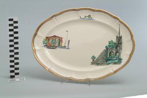 Piatto da portata di forma ovale avente la tesa leggermente sagomata e l'orlo ondulato. Il fondo è bianco mentre i decori sono a smalti policromi e sono distribuiti liberamente sul fondo del piatto e sulla tesa. L'orlo è dorato e rifinito da una piccola fascia smaltata a tratteggio incrociato in rosso.