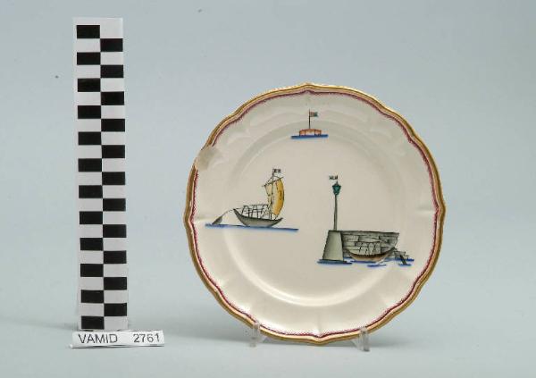 - NOTIZIE STORICO CRITICHE Il piatto da formaggio in esame fa parte del servizio forma "Vecchio Milano" con decoro "Lago Maggiore": vi sono raffigurati elementi caratteristici della vita sul lago (un molo con faro e una barca tipica, detta burchiello, all'ancora, una boa con bandierina e un'altra barca da pesca in navigazione) rappresentati in un'atmosfera sospesa e silenziosa, seppur ridente nella resa stilizzata e nel fresco cromatismo delle raffigurazioni. Fin dalla sua nomina a direttore artistico della "S.C.I.", Guido Andlovitz si prefisse di rigenerare le forme tradizionali con decori nuovi. E' il caso della forma "Vecchio Milano" cui adattò nel 1931 il nuovissimo decoro "Lago Maggiore", a conferma che una decorazione nuova, se concepita organicamente, può conferire un aspetto attuale e "scattante" anche a una bella forma tradizionale. Fu certamente uno dei servizi più prestigiosi della produzione del momento se Andlovitz lo concepì in piccolissima serie e se l'azienda gli consentì - caso unico- di firmarlo nella marca. La scritta Verbano e la data 1931 presenti nel marchio suggeriscono che probabilmente il servizio fu realizzato per celebrare nel 1931 l'inizio della produzione di porcellana da tavola a Laveno nello stabilimento Verbano. Nell'ambito dei repertori decorativi creati dall'Andlovtz il decoro "Lago Maggiore" rappresenta un modo frazionato di raffigurare il paesaggio, definito da Mario Munari a "scena spezzata". L'impianto decorativo di queste ceramiche rifugge dalla centralità e dalla strutturazioni lungo diretrici ortogonali, mentre vi predominano l'asimmetria e le fughe visuali sghembe che risentono del gusto per la cineseria e il giapponismo. La semplificazione geometrica degli elementi e il modo di sfumare i corpi nel'intento di suggerirne la volumetria ricorda le opere di Carlo Carrà degli anni venti. Nel decoro "Lago Maggiore" sono presenti espressioni diversificate di un tema molto caro a Guido Andlovitz: i "paesaggi d'acqua" con particolare ricorrenza delle 'barche' raffigurate in una vasta gamma di tipi, generalmente riprese da modelli reali e con divertenti variazioni fantastiche. Il decoro Lago fu applicato in un primo momento sulla forma "Vecchio Milano", poi sulla forma "Pomezia" (1936 ca.). Del decoro Lago esistono diversi disegni originali a matita, pastello, inchiostro e acquerello su carta conservati nel fondo archivistico della "S.C.I.": alcuni di questi raffigurano il decoro proprio sulla forma "Vecchio Milano" con le rifiniture che compaiono sui pezzi finiti. Nel Museo è conservato anche un altro servizio forma "Vecchio Milano" con decoro "Lago Maggiore", ma più ridotto nella quantità e nella varietà dei componenti e con filettatura monocroma (num. inv. 2051...3517). Negli anni '90 la Richard Ginori ha rimesso in produzione il servizio Lago.\nIl servizio in esame è eseguito a colaggio, mentre i decori sono realizzati a decalcomania (o transfer): si vedano in proposito le lastre in rame acciaiato conservate nel Museo e raffiguranti molti dei decori presenti nel servizio in combinazioni diversificate (nn. inv. 2480, 2483, 2484, 2485). Tipologicamente si lega ad un servizio da caffé (num. inv. 2672...2900).\nIl piatto da formaggio è stato donato da Vanna Scotti Meregalli, nipote di Vanna Scotti, figlia dell'Ing. Luciano Scotti che fu direttore generale della "S.C.I." dal 1916.