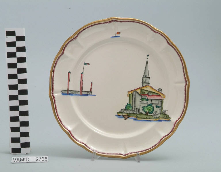 - NOTIZIE STORICO CRITICHE Il piatto piano in esame fa parte del servizio forma "Vecchio Milano" con decoro "Lago Maggiore": vi è raffigurata una veduta dell'Isola dei Pescatori con il campanile della chiesa svettante dai tetti delle case e alcuni elementi caratteristici del lago (una bandierina segnaletica galleggiante piegata dal vento e una zattera con pali di ormeggio) che sono rappresentati in un'atmosfera sospesa e silenziosa, seppur ridente nella resa stilizzata e nel fresco cromatismo delle raffigurazioni. Fin dalla sua nomina a direttore artistico della "S.C.I.", Guido Andlovitz si prefisse di rigenerare le forme tradizionali con decori nuovi. E' il caso della forma "Vecchio Milano" cui adattò nel 1931 il nuovissimo decoro "Lago Maggiore", a conferma che una decorazione nuova, se concepita organicamente, può conferire un aspetto attuale e "scattante" anche a una bella forma tradizionale. Fu certamente uno dei servizi più prestigiosi della produzione del momento se Andlovitz lo concepì in piccolissima serie e se l'azienda gli consentì - caso unico- di firmarlo nella marca. La scritta Verbano e la data 1931 presenti nel marchio suggeriscono che probabilmente il servizio fu realizzato per celebrare nel 1931 l'inizio della produzione di porcellana da tavola a Laveno nello stabilimento Verbano. Nell'ambito dei repertori decorativi creati dall'Andlovtz il decoro "Lago Maggiore" rappresenta un modo frazionato di raffigurare il paesaggio, definito da Mario Munari a "scena spezzata". L'impianto decorativo di queste ceramiche rifugge dalla centralità e dalla strutturazioni lungo diretrici ortogonali, mentre vi predominano l'asimmetria e le fughe visuali sghembe che risentono del gusto per la cineseria e il giapponismo. La semplificazione geometrica degli elementi e il modo di sfumare i corpi nel'intento di suggerirne la volumetria ricorda le opere di Carlo Carrà degli anni venti. Nel decoro "Lago Maggiore" sono presenti espressioni diversificate di un tema molto caro a Guido Andlovitz: i "paesaggi d'acqua" con particolare ricorrenza delle 'barche' raffigurate in una vasta gamma di tipi, generalmente riprese da modelli reali e con divertenti variazioni fantastiche. Il decoro Lago fu applicato in un primo momento sulla forma "Vecchio Milano", poi sulla forma "Pomezia" (1936 ca.). Del decoro Lago esistono diversi disegni originali a matita, pastello, inchiostro e acquerello su carta conservati nel fondo archivistico della "S.C.I.": alcuni di questi raffigurano il decoro proprio sulla forma "Vecchio Milano" con le rifiniture che compaiono sui pezzi finiti. Nel Museo è conservato anche un altro servizio forma "Vecchio Milano" con decoro "Lago Maggiore", ma più ridotto nella quantità e nella varietà dei componenti e con filettatura monocroma (num. inv. 2051...3517). Negli anni '90 la Richard Ginori ha rimesso in produzione il servizio Lago.\nIl servizio in esame è eseguito a colaggio, mentre i decori sono realizzati a decalcomania (o transfer): si vedano in proposito le lastre in rame acciaiato conservate nel Museo e raffiguranti molti dei decori presenti nel servizio in combinazioni diversificate (nn. inv. 2480, 2483, 2484, 2485). Tipologicamente si lega ad un servizio da caffé (num. inv. 2672...2900).\nIl piatto piano è stato donato da Vanna Scotti Meregalli, nipote di Vanna Scotti, figlia dell'Ing. Luciano Scotti che fu direttore generale della "S.C.I." dal 1916.