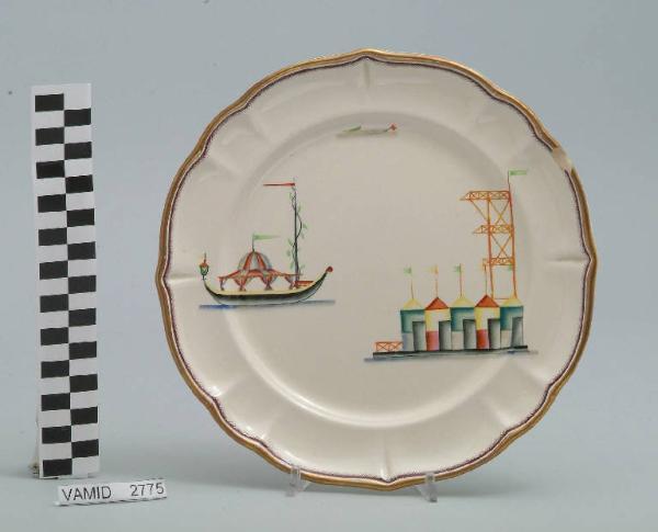• NOTIZIE STORICO CRITICHE Il piatto piano in esame fa parte del servizio forma "Vecchio Milano" con decoro "Lago Maggiore": vi è raffigurata una veduta di uno stabilimento balneare con cabine colorate e un trampolino, e alcuni elementi caratteristici della vita sul lago (una gondola da parata con tendaggio a strisce e lanterna, e un motoscafo), rappresentati in un'atmosfera sospesa e silenziosa, seppur ridente nella resa stilizzata e nel fresco cromatismo delle raffigurazioni. Fin dalla sua nomina a direttore artistico della "S.C.I.", Guido Andlovitz si prefisse di rigenerare le forme tradizionali con decori nuovi. E' il caso della forma "Vecchio Milano" cui adattò nel 1931 il nuovissimo decoro "Lago Maggiore", a conferma che una decorazione nuova, se concepita organicamente, può conferire un aspetto attuale e "scattante" anche a una bella forma tradizionale. Fu certamente uno dei servizi più prestigiosi della produzione del momento se Andlovitz lo concepì in piccolissima serie e se l'azienda gli consentì - caso unico- di firmarlo nella marca. La scritta Verbano e la data 1931 presenti nel marchio suggeriscono che probabilmente il servizio fu realizzato per celebrare nel 1931 l'inizio della produzione di porcellana da tavola a Laveno nello stabilimento Verbano. Nell'ambito dei repertori decorativi creati dall'Andlovtz il decoro "Lago Maggiore" rappresenta un modo frazionato di raffigurare il paesaggio, definito da Mario Munari a "scena spezzata". L'impianto decorativo di queste ceramiche rifugge dalla centralità e dalla strutturazioni lungo diretrici ortogonali, mentre vi predominano l'asimmetria e le fughe visuali sghembe che risentono del gusto per la cineseria e il giapponismo. La semplificazione geometrica degli elementi e il modo di sfumare i corpi nel'intento di suggerirne la volumetria ricorda le opere di Carlo Carrà degli anni venti. Nel decoro "Lago Maggiore" sono presenti espressioni diversificate di un tema molto caro a Guido Andlovitz: i "paesaggi d'acqua" con particolare ricorrenza delle 'barche' raffigurate in una vasta gamma di tipi, generalmente riprese da modelli reali e con divertenti variazioni fantastiche. Il decoro Lago fu applicato in un primo momento sulla forma "Vecchio Milano", poi sulla forma "Pomezia" (1936 ca.). Del decoro Lago esistono diversi disegni originali a matita, pastello, inchiostro e acquerello su carta conservati nel fondo archivistico della "S.C.I.": alcuni di questi raffigurano il decoro proprio sulla forma "Vecchio Milano" con le rifiniture che compaiono sui pezzi finiti. Nel Museo è conservato anche un altro servizio forma "Vecchio Milano" con decoro "Lago Maggiore", ma più ridotto nella quantità e nella varietà dei componenti e con filettatura monocroma (num. inv. 2051...3517). Negli anni '90 la Richard Ginori ha rimesso in produzione il servizio Lago.\nIl servizio in esame è eseguito a colaggio, mentre i decori sono realizzati a decalcomania (o transfer): si vedano in proposito le lastre in rame acciaiato conservate nel Museo e raffiguranti molti dei decori presenti nel servizio in combinazioni diversificate (nn. inv. 2480, 2483, 2484, 2485). Tipologicamente si lega ad un servizio da caffé (num. inv. 2672...2900).\nIl piatto piano è stato donato da Vanna Scotti Meregalli, nipote di Vanna Scotti, figlia dell'Ing. Luciano Scotti che fu direttore generale della "S.C.I." dal 1916.
