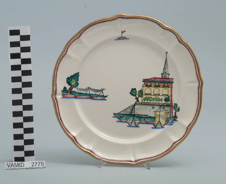 - NOTIZIE STORICO CRITICHE Il piatto piano in esame fa parte del servizio forma "Vecchio Milano" con decoro "Lago Maggiore": vi sono raffigurati una veduta dell'Isola dei Pescatori con il campanile della chiesa svettante dalle case e due barche da pesca e alcuni elementi caratteristici della vita sul lago (le reti ad asciugare sulla riva e una boa segnaletica con bandierina), rappresentati in un'atmosfera sospesa e silenziosa, seppur ridente nella resa stilizzata e nel fresco cromatismo delle raffigurazioni. Questa stessa combinazione dei tre soggetti è presente in un disegno autografo dell'Andlovitz (cfr. "Guido Andloviz. Designer e direttore ...", 1995, p. 70 fig. 98). Fin dalla sua nomina a direttore artistico della "S.C.I.", Guido Andlovitz si prefisse di rigenerare le forme tradizionali con decori nuovi. E' il caso della forma "Vecchio Milano" cui adattò nel 1931 il nuovissimo decoro "Lago Maggiore", a conferma che una decorazione nuova, se concepita organicamente, può conferire un aspetto attuale e "scattante" anche a una bella forma tradizionale. Fu certamente uno dei servizi più prestigiosi della produzione del momento se Andlovitz lo concepì in piccolissima serie e se l'azienda gli consentì - caso unico- di firmarlo nella marca. La scritta Verbano e la data 1931 presenti nel marchio suggeriscono che probabilmente il servizio fu realizzato per celebrare nel 1931 l'inizio della produzione di porcellana da tavola a Laveno nello stabilimento Verbano. Nell'ambito dei repertori decorativi creati dall'Andlovtz il decoro "Lago Maggiore" rappresenta un modo frazionato di raffigurare il paesaggio, definito da Mario Munari a "scena spezzata". L'impianto decorativo di queste ceramiche rifugge dalla centralità e dalla strutturazioni lungo diretrici ortogonali, mentre vi predominano l'asimmetria e le fughe visuali sghembe che risentono del gusto per la cineseria e il giapponismo. La semplificazione geometrica degli elementi e il modo di sfumare i corpi nel'intento di suggerirne la volumetria ricorda le opere di Carlo Carrà degli anni venti. Nel decoro "Lago Maggiore" sono presenti espressioni diversificate di un tema molto caro a Guido Andlovitz: i "paesaggi d'acqua" con particolare ricorrenza delle 'barche' raffigurate in una vasta gamma di tipi, generalmente riprese da modelli reali e con divertenti variazioni fantastiche. Il decoro Lago fu applicato in un primo momento sulla forma "Vecchio Milano", poi sulla forma "Pomezia" (1936 ca.). Del decoro Lago esistono diversi disegni originali a matita, pastello, inchiostro e acquerello su carta conservati nel fondo archivistico della "S.C.I.": alcuni di questi raffigurano il decoro proprio sulla forma "Vecchio Milano" con le rifiniture che compaiono sui pezzi finiti. Nel Museo è conservato anche un altro servizio forma "Vecchio Milano" con decoro "Lago Maggiore", ma più ridotto nella quantità e nella varietà dei componenti e con filettatura monocroma (num. inv. 2051...3517). Negli anni '90 la Richard Ginori ha rimesso in produzione il servizio Lago.\nIl servizio in esame è eseguito a colaggio, mentre i decori sono realizzati a decalcomania (o transfer): si vedano in proposito le lastre in rame acciaiato conservate nel Museo e raffiguranti molti dei decori presenti nel servizio in combinazioni diversificate (nn. inv. 2480, 2483, 2484, 2485). Tipologicamente si lega ad un servizio da caffé (num. inv. 2672...2900).\nIl piatto piano è stato donato da Vanna Scotti Meregalli, nipote di Vanna Scotti, figlia dell'Ing. Luciano Scotti che fu direttore generale della "S.C.I." dal 1916.