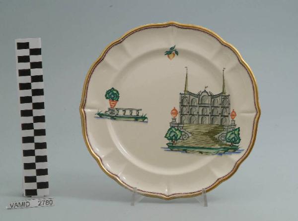 - NOTIZIE STORICO CRITICHE Il piatto piano in esame fa parte del servizio forma "Vecchio Milano" con decoro "Lago Maggiore": vi sono raffigurati una veduta del Ninfeo nell'Isola Bella e alcuni elementi caratteristici della vita sul lago (la balaustrata con vaso decorativo tipici di tanti giardini storici che si affacciano sul lago e il frutto del limone), rappresentati in un'atmosfera sospesa e silenziosa, seppur ridente nella resa stilizzata e nel fresco cromatismo delle raffigurazioni. Questa stessa combinazione dei tre soggetti è presente in un disegno autografo dell'Andlovitz (cfr. "Guido Andloviz. Designer e direttore ...", 1995, p. 70 fig. 98). Fin dalla sua nomina a direttore artistico della "S.C.I.", Guido Andlovitz si prefisse di rigenerare le forme tradizionali con decori nuovi. E' il caso della forma "Vecchio Milano" cui adattò nel 1931 il nuovissimo decoro "Lago Maggiore", a conferma che una decorazione nuova, se concepita organicamente, può conferire un aspetto attuale e "scattante" anche a una bella forma tradizionale. Fu certamente uno dei servizi più prestigiosi della produzione del momento se Andlovitz lo concepì in piccolissima serie e se l'azienda gli consentì - caso unico- di firmarlo nella marca. La scritta Verbano e la data 1931 presenti nel marchio suggeriscono che probabilmente il servizio fu realizzato per celebrare nel 1931 l'inizio della produzione di porcellana da tavola a Laveno nello stabilimento Verbano. Nell'ambito dei repertori decorativi creati dall'Andlovtz il decoro "Lago Maggiore" rappresenta un modo frazionato di raffigurare il paesaggio, definito da Mario Munari a "scena spezzata". L'impianto decorativo di queste ceramiche rifugge dalla centralità e dalla strutturazioni lungo diretrici ortogonali, mentre vi predominano l'asimmetria e le fughe visuali sghembe che risentono del gusto per la cineseria e il giapponismo. La semplificazione geometrica degli elementi e il modo di sfumare i corpi nel'intento di suggerirne la volumetria ricorda le opere di Carlo Carrà degli anni venti. Nel decoro "Lago Maggiore" sono presenti espressioni diversificate di un tema molto caro a Guido Andlovitz: i "paesaggi d'acqua" con particolare ricorrenza delle 'barche' raffigurate in una vasta gamma di tipi, generalmente riprese da modelli reali e con divertenti variazioni fantastiche. Il decoro Lago fu applicato in un primo momento sulla forma "Vecchio Milano", poi sulla forma "Pomezia" (1936 ca.). Del decoro Lago esistono diversi disegni originali a matita, pastello, inchiostro e acquerello su carta conservati nel fondo archivistico della "S.C.I.": alcuni di questi raffigurano il decoro proprio sulla forma "Vecchio Milano" con le rifiniture che compaiono sui pezzi finiti. Nel Museo è conservato anche un altro servizio forma "Vecchio Milano" con decoro "Lago Maggiore", ma più ridotto nella quantità e nella varietà dei componenti e con filettatura monocroma (num. inv. 2051...3517). Negli anni '90 la Richard Ginori ha rimesso in produzione il servizio Lago.\nIl servizio in esame è eseguito a colaggio, mentre i decori sono realizzati a decalcomania (o transfer): si vedano in proposito le lastre in rame acciaiato conservate nel Museo e raffiguranti molti dei decori presenti nel servizio in combinazioni diversificate (nn. inv. 2480, 2483, 2484, 2485). Tipologicamente si lega ad un servizio da caffé (num. inv. 2672...2900).\nIl piatto piano è stato donato da Vanna Scotti Meregalli, nipote di Vanna Scotti, figlia dell'Ing. Luciano Scotti che fu direttore generale della "S.C.I." dal 1916.