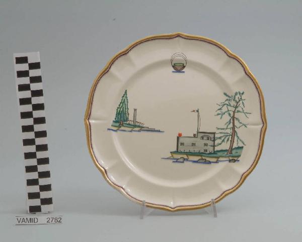 - NOTIZIE STORICO CRITICHE Il piatto piano in esame fa parte del servizio forma "Vecchio Milano" con decoro "Lago Maggiore": vi è raffigurata una veduta del Fortino di Cerro, attuale villa Rasini (curiosamente sul tetto sono appoggiate due anfore in riferimento alla produzione S.C.I.) e alcuni elementi caratteristici del lago (una sponda con un cipresso e una colonna e una barca da pesca tipica, detta burchiello) che sono rappresentati in un'atmosfera sospesa e silenziosa, seppur ridente nella resa stilizzata e nel fresco cromatismo delle raffigurazioni. Fin dalla sua nomina a direttore artistico della "S.C.I.", Guido Andlovitz si prefisse di rigenerare le forme tradizionali con decori nuovi. E' il caso della forma "Vecchio Milano" cui adattò nel 1931 il nuovissimo decoro "Lago Maggiore", a conferma che una decorazione nuova, se concepita organicamente, può conferire un aspetto attuale e "scattante" anche a una bella forma tradizionale. Fu certamente uno dei servizi più prestigiosi della produzione del momento se Andlovitz lo concepì in piccolissima serie e se l'azienda gli consentì - caso unico- di firmarlo nella marca. La scritta Verbano e la data 1931 presenti nel marchio suggeriscono che probabilmente il servizio fu realizzato per celebrare nel 1931 l'inizio della produzione di porcellana da tavola a Laveno nello stabilimento Verbano. Nell'ambito dei repertori decorativi creati dall'Andlovtz il decoro "Lago Maggiore" rappresenta un modo frazionato di raffigurare il paesaggio, definito da Mario Munari a "scena spezzata". L'impianto decorativo di queste ceramiche rifugge dalla centralità e dalla strutturazioni lungo diretrici ortogonali, mentre vi predominano l'asimmetria e le fughe visuali sghembe che risentono del gusto per la cineseria e il giapponismo. La semplificazione geometrica degli elementi e il modo di sfumare i corpi nel'intento di suggerirne la volumetria ricorda le opere di Carlo Carrà degli anni venti. Nel decoro "Lago Maggiore" sono presenti espressioni diversificate di un tema molto caro a Guido Andlovitz: i "paesaggi d'acqua" con particolare ricorrenza delle 'barche' raffigurate in una vasta gamma di tipi, generalmente riprese da modelli reali e con divertenti variazioni fantastiche. Il decoro Lago fu applicato in un primo momento sulla forma "Vecchio Milano", poi sulla forma "Pomezia" (1936 ca.). Del decoro Lago esistono diversi disegni originali a matita, pastello, inchiostro e acquerello su carta conservati nel fondo archivistico della "S.C.I.": alcuni di questi raffigurano il decoro proprio sulla forma "Vecchio Milano" con le rifiniture che compaiono sui pezzi finiti. Nel Museo è conservato anche un altro servizio forma "Vecchio Milano" con decoro "Lago Maggiore", ma più ridotto nella quantità e nella varietà dei componenti e con filettatura monocroma (num. inv. 2051...3517). Negli anni '90 la Richard Ginori ha rimesso in produzione il servizio Lago.\nIl servizio in esame è eseguito a colaggio, mentre i decori sono realizzati a decalcomania (o transfer): si vedano in proposito le lastre in rame acciaiato conservate nel Museo e raffiguranti molti dei decori presenti nel servizio in combinazioni diversificate (nn. inv. 2480, 2483, 2484, 2485). Tipologicamente si lega ad un servizio da caffé (num. inv. 2672...2900).\nIl piatto piano è stato donato da Vanna Scotti Meregalli, nipote di Vanna Scotti, figlia dell'Ing. Luciano Scotti che fu direttore generale della "S.C.I." dal 1916.