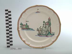 - NOTIZIE STORICO CRITICHE Il piatto piano in esame fa parte del servizio forma "Vecchio Milano" con decoro "Lago Maggiore": vi sono raffigurati una veduta di una chiesa con campanile e accesso al lago mediante una scalinata e alcuni elementi caratteristici della vita sul lago (un fortino con bandiera italiana sulla riva e una boa con bandierina), rappresentati in un'atmosfera sospesa e silenziosa, seppur ridente nella resa stilizzata e nel fresco cromatismo delle raffigurazioni. Fin dalla sua nomina a direttore artistico della "S.C.I.", Guido Andlovitz si prefisse di rigenerare le forme tradizionali con decori nuovi. E' il caso della forma "Vecchio Milano" cui adattò nel 1931 il nuovissimo decoro "Lago Maggiore", a conferma che una decorazione nuova, se concepita organicamente, può conferire un aspetto attuale e "scattante" anche a una bella forma tradizionale. Fu certamente uno dei servizi più prestigiosi della produzione del momento se Andlovitz lo concepì in piccolissima serie e se l'azienda gli consentì - caso unico- di firmarlo nella marca. La scritta Verbano e la data 1931 presenti nel marchio suggeriscono che probabilmente il servizio fu realizzato per celebrare nel 1931 l'inizio della produzione di porcellana da tavola a Laveno nello stabilimento Verbano. Nell'ambito dei repertori decorativi creati dall'Andlovtz il decoro "Lago Maggiore" rappresenta un modo frazionato di raffigurare il paesaggio, definito da Mario Munari a "scena spezzata". L'impianto decorativo di queste ceramiche rifugge dalla centralità e dalla strutturazioni lungo diretrici ortogonali, mentre vi predominano l'asimmetria e le fughe visuali sghembe che risentono del gusto per la cineseria e il giapponismo. La semplificazione geometrica degli elementi e il modo di sfumare i corpi nel'intento di suggerirne la volumetria ricorda le opere di Carlo Carrà degli anni venti. Nel decoro "Lago Maggiore" sono presenti espressioni diversificate di un tema molto caro a Guido Andlovitz: i "paesaggi d'acqua" con particolare ricorrenza delle 'barche' raffigurate in una vasta gamma di tipi, generalmente riprese da modelli reali e con divertenti variazioni fantastiche. Il decoro Lago fu applicato in un primo momento sulla forma "Vecchio Milano", poi sulla forma "Pomezia" (1936 ca.). Del decoro Lago esistono diversi disegni originali a matita, pastello, inchiostro e acquerello su carta conservati nel fondo archivistico della "S.C.I.": alcuni di questi raffigurano il decoro proprio sulla forma "Vecchio Milano" con le rifiniture che compaiono sui pezzi finiti. Nel Museo è conservato anche un altro servizio forma "Vecchio Milano" con decoro "Lago Maggiore", ma più ridotto nella quantità e nella varietà dei componenti e con filettatura monocroma (num. inv. 2051...3517). Negli anni '90 la Richard Ginori ha rimesso in produzione il servizio Lago.\nIl servizio in esame è eseguito a colaggio, mentre i decori sono realizzati a decalcomania (o transfer): si vedano in proposito le lastre in rame acciaiato conservate nel Museo e raffiguranti molti dei decori presenti nel servizio in combinazioni diversificate (nn. inv. 2480, 2483, 2484, 2485). Tipologicamente si lega ad un servizio da caffé (num. inv. 2672...2900).\nIl piatto piano è stato donato da Vanna Scotti Meregalli, nipote di Vanna Scotti, figlia dell'Ing. Luciano Scotti che fu direttore generale della "S.C.I." dal 1916.