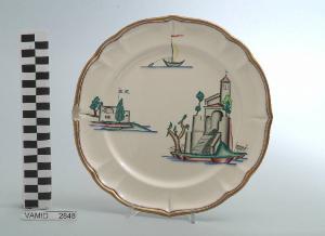 - NOTIZIE STORICO CRITICHE Il piatto piano in esame fa parte del servizio forma "Vecchio Milano" con decoro "Lago Maggiore": vi sono raffigurati una veduta di una chiesa con campanile e accesso al lago mediante una scalinata e alcuni elementi caratteristici della vita sul lago (un fortino con bandiera italiana sulla riva, e una boa con bandierina), rappresentati in un'atmosfera sospesa e silenziosa, seppur ridente nella resa stilizzata e nel fresco cromatismo delle raffigurazioni. Fin dalla sua nomina a direttore artistico della "S.C.I.", Guido Andlovitz si prefisse di rigenerare le forme tradizionali con decori nuovi. E' il caso della forma "Vecchio Milano" cui adattò nel 1931 il nuovissimo decoro "Lago Maggiore", a conferma che una decorazione nuova, se concepita organicamente, può conferire un aspetto attuale e "scattante" anche a una bella forma tradizionale. Fu certamente uno dei servizi più prestigiosi della produzione del momento se Andlovitz lo concepì in piccolissima serie e se l'azienda gli consentì - caso unico- di firmarlo nella marca. La scritta Verbano e la data 1931 presenti nel marchio suggeriscono che probabilmente il servizio fu realizzato per celebrare nel 1931 l'inizio della produzione di porcellana da tavola a Laveno nello stabilimento Verbano. Nell'ambito dei repertori decorativi creati dall'Andlovtz il decoro "Lago Maggiore" rappresenta un modo frazionato di raffigurare il paesaggio, definito da Mario Munari a "scena spezzata". L'impianto decorativo di queste ceramiche rifugge dalla centralità e dalla strutturazioni lungo diretrici ortogonali, mentre vi predominano l'asimmetria e le fughe visuali sghembe che risentono del gusto per la cineseria e il giapponismo. La semplificazione geometrica degli elementi e il modo di sfumare i corpi nel'intento di suggerirne la volumetria ricorda le opere di Carlo Carrà degli anni venti. Nel decoro "Lago Maggiore" sono presenti espressioni diversificate di un tema molto caro a Guido Andlovitz: i "paesaggi d'acqua" con particolare ricorrenza delle 'barche' raffigurate in una vasta gamma di tipi, generalmente riprese da modelli reali e con divertenti variazioni fantastiche. Il decoro Lago fu applicato in un primo momento sulla forma "Vecchio Milano", poi sulla forma "Pomezia" (1936 ca.). Del decoro Lago esistono diversi disegni originali a matita, pastello, inchiostro e acquerello su carta conservati nel fondo archivistico della "S.C.I.": alcuni di questi raffigurano il decoro proprio sulla forma "Vecchio Milano" con le rifiniture che compaiono sui pezzi finiti. Nel Museo è conservato anche un altro servizio forma "Vecchio Milano" con decoro "Lago Maggiore", ma più ridotto nella quantità e nella varietà dei componenti e con filettatura monocroma (num. inv. 2051...3517). Negli anni '90 la Richard Ginori ha rimesso in produzione il servizio Lago.\nIl servizio in esame è eseguito a colaggio, mentre i decori sono realizzati a decalcomania (o transfer): si vedano in proposito le lastre in rame acciaiato conservate nel Museo e raffiguranti molti dei decori presenti nel servizio in combinazioni diversificate (nn. inv. 2480, 2483, 2484, 2485). Tipologicamente si lega ad un servizio da caffé (num. inv. 2672...2900).\nIl piatto piano è stato donato da Vanna Scotti Meregalli, nipote di Vanna Scotti, figlia dell'Ing. Luciano Scotti che fu direttore generale della "S.C.I." dal 1916.