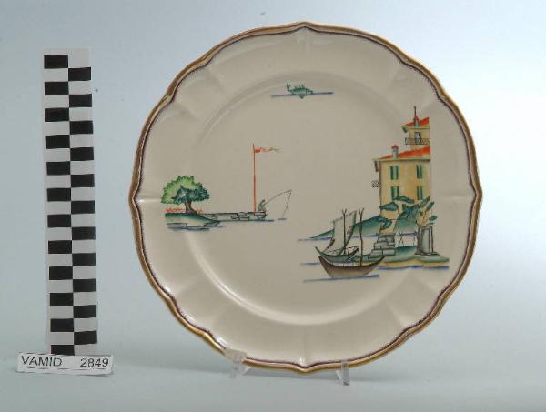 - NOTIZIE STORICO CRITICHE Il piatto piano in esame fa parte del servizio forma "Vecchio Milano" con decoro "Lago Maggiore": vi sono raffigurati uno scorcio minore con case su un arco che si affacciano sul lago e barche da pesca tipiche, dette burchielli, e alcuni elementi caratteristici della vita sul lago (un molo con un pescatore e un pesce di lago che affiora dall'acqua), rappresentati in un'atmosfera sospesa e silenziosa, seppur ridente nella resa stilizzata e nel fresco cromatismo delle raffigurazioni. Fin dalla sua nomina a direttore artistico della "S.C.I.", Guido Andlovitz si prefisse di rigenerare le forme tradizionali con decori nuovi. E' il caso della forma "Vecchio Milano" cui adattò nel 1931 il nuovissimo decoro "Lago Maggiore", a conferma che una decorazione nuova, se concepita organicamente, può conferire un aspetto attuale e "scattante" anche a una bella forma tradizionale. Fu certamente uno dei servizi più prestigiosi della produzione del momento se Andlovitz lo concepì in piccolissima serie e se l'azienda gli consentì - caso unico- di firmarlo nella marca. La scritta Verbano e la data 1931 presenti nel marchio suggeriscono che probabilmente il servizio fu realizzato per celebrare nel 1931 l'inizio della produzione di porcellana da tavola a Laveno nello stabilimento Verbano. Nell'ambito dei repertori decorativi creati dall'Andlovtz il decoro "Lago Maggiore" rappresenta un modo frazionato di raffigurare il paesaggio, definito da Mario Munari a "scena spezzata". L'impianto decorativo di queste ceramiche rifugge dalla centralità e dalla strutturazioni lungo diretrici ortogonali, mentre vi predominano l'asimmetria e le fughe visuali sghembe che risentono del gusto per la cineseria e il giapponismo. La semplificazione geometrica degli elementi e il modo di sfumare i corpi nel'intento di suggerirne la volumetria ricorda le opere di Carlo Carrà degli anni venti. Nel decoro "Lago Maggiore" sono presenti espressioni diversificate di un tema molto caro a Guido Andlovitz: i "paesaggi d'acqua" con particolare ricorrenza delle 'barche' raffigurate in una vasta gamma di tipi, generalmente riprese da modelli reali e con divertenti variazioni fantastiche. Il decoro Lago fu applicato in un primo momento sulla forma "Vecchio Milano", poi sulla forma "Pomezia" (1936 ca.). Del decoro Lago esistono diversi disegni originali a matita, pastello, inchiostro e acquerello su carta conservati nel fondo archivistico della "S.C.I.": alcuni di questi raffigurano il decoro proprio sulla forma "Vecchio Milano" con le rifiniture che compaiono sui pezzi finiti. Nel Museo è conservato anche un altro servizio forma "Vecchio Milano" con decoro "Lago Maggiore", ma più ridotto nella quantità e nella varietà dei componenti e con filettatura monocroma (num. inv. 2051...3517). Negli anni '90 la Richard Ginori ha rimesso in produzione il servizio Lago.\nIl servizio in esame è eseguito a colaggio, mentre i decori sono realizzati a decalcomania (o transfer): si vedano in proposito le lastre in rame acciaiato conservate nel Museo e raffiguranti molti dei decori presenti nel servizio in combinazioni diversificate (nn. inv. 2480, 2483, 2484, 2485). Tipologicamente si lega ad un servizio da caffé (num. inv. 2672...2900).\nIl piatto piano è stato donato da Vanna Scotti Meregalli, nipote di Vanna Scotti, figlia dell'Ing. Luciano Scotti che fu direttore generale della "S.C.I." dal 1916.