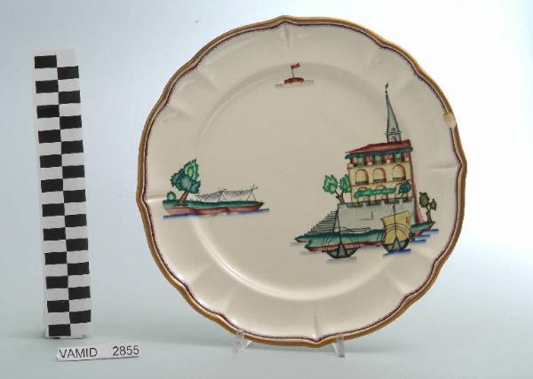 - NOTIZIE STORICO CRITICHE Il piatto piano in esame fa parte del servizio forma "Vecchio Milano" con decoro "Lago Maggiore": vi sono raffigurati una veduta dell'Isola dei Pescatori con il campanile della chiesa svettante dalle case e due barche da pesca e alcuni elementi caratteristici della vita sul lago (le reti ad asciugare sulla riva e una boa segnaletica con bandierina), rappresentati in un'atmosfera sospesa e silenziosa, seppur ridente nella resa stilizzata e nel fresco cromatismo delle raffigurazioni. Questa stessa combinazione dei tre soggetti è presente in un disegno autografo dell'Andlovitz (cfr. "Guido Andloviz. Designer e direttore ...", 1995, p. 70 fig. 98). Fin dalla sua nomina a direttore artistico della "S.C.I.", Guido Andlovitz si prefisse di rigenerare le forme tradizionali con decori nuovi. E' il caso della forma "Vecchio Milano" cui adattò nel 1931 il nuovissimo decoro "Lago Maggiore", a conferma che una decorazione nuova, se concepita organicamente, può conferire un aspetto attuale e "scattante" anche a una bella forma tradizionale. Fu certamente uno dei servizi più prestigiosi della produzione del momento se Andlovitz lo concepì in piccolissima serie e se l'azienda gli consentì - caso unico- di firmarlo nella marca. La scritta Verbano e la data 1931 presenti nel marchio suggeriscono che probabilmente il servizio fu realizzato per celebrare nel 1931 l'inizio della produzione di porcellana da tavola a Laveno nello stabilimento Verbano. Nell'ambito dei repertori decorativi creati dall'Andlovtz il decoro "Lago Maggiore" rappresenta un modo frazionato di raffigurare il paesaggio, definito da Mario Munari a "scena spezzata". L'impianto decorativo di queste ceramiche rifugge dalla centralità e dalla strutturazioni lungo diretrici ortogonali, mentre vi predominano l'asimmetria e le fughe visuali sghembe che risentono del gusto per la cineseria e il giapponismo. La semplificazione geometrica degli elementi e il modo di sfumare i corpi nel'intento di suggerirne la volumetria ricorda le opere di Carlo Carrà degli anni venti. Nel decoro "Lago Maggiore" sono presenti espressioni diversificate di un tema molto caro a Guido Andlovitz: i "paesaggi d'acqua" con particolare ricorrenza delle 'barche' raffigurate in una vasta gamma di tipi, generalmente riprese da modelli reali e con divertenti variazioni fantastiche. Il decoro Lago fu applicato in un primo momento sulla forma "Vecchio Milano", poi sulla forma "Pomezia" (1936 ca.). Del decoro Lago esistono diversi disegni originali a matita, pastello, inchiostro e acquerello su carta conservati nel fondo archivistico della "S.C.I.": alcuni di questi raffigurano il decoro proprio sulla forma "Vecchio Milano" con le rifiniture che compaiono sui pezzi finiti. Nel Museo è conservato anche un altro servizio forma "Vecchio Milano" con decoro "Lago Maggiore", ma più ridotto nella quantità e nella varietà dei componenti e con filettatura monocroma (num. inv. 2051...3517). Negli anni '90 la Richard Ginori ha rimesso in produzione il servizio Lago.\nIl servizio in esame è eseguito a colaggio, mentre i decori sono realizzati a decalcomania (o transfer): si vedano in proposito le lastre in rame acciaiato conservate nel Museo e raffiguranti molti dei decori presenti nel servizio in combinazioni diversificate (nn. inv. 2480, 2483, 2484, 2485). Tipologicamente si lega ad un servizio da caffé (num. inv. 2672...2900).\nIl piatto piano è stato donato da Vanna Scotti Meregalli, nipote di Vanna Scotti, figlia dell'Ing. Luciano Scotti che fu direttore generale della "S.C.I." dal 1916.