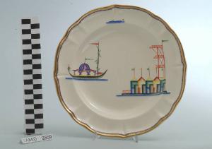 - NOTIZIE STORICO CRITICHE Il piatto fondo in esame fa parte del servizio forma "Vecchio Milano" con decoro "Lago Maggiore": vi sono raffigurati una veduta di uno stabilimento balneare con cabine colorate e un trampolino, e alcuni elementi caratteristici della vita sul lago (una gondola da parata con tendaggio a strisce e lanterna, e un motoscafo), rappresentati in un'atmosfera sospesa e silenziosa, seppur ridente nella resa stilizzata e nel fresco cromatismo delle raffigurazioni. Fin dalla sua nomina a direttore artistico della "S.C.I.", Guido Andlovitz si prefisse di rigenerare le forme tradizionali con decori nuovi. E' il caso della forma "Vecchio Milano" cui adattò nel 1931 il nuovissimo decoro "Lago Maggiore", a conferma che una decorazione nuova, se concepita organicamente, può conferire un aspetto attuale e "scattante" anche a una bella forma tradizionale. Fu certamente uno dei servizi più prestigiosi della produzione del momento se Andlovitz lo concepì in piccolissima serie e se l'azienda gli consentì - caso unico- di firmarlo nella marca. La scritta Verbano e la data 1931 presenti nel marchio suggeriscono che probabilmente il servizio fu realizzato per celebrare nel 1931 l'inizio della produzione di porcellana da tavola a Laveno nello stabilimento Verbano. Nell'ambito dei repertori decorativi creati dall'Andlovtz il decoro "Lago Maggiore" rappresenta un modo frazionato di raffigurare il paesaggio, definito da Mario Munari a "scena spezzata". L'impianto decorativo di queste ceramiche rifugge dalla centralità e dalla strutturazioni lungo diretrici ortogonali, mentre vi predominano l'asimmetria e le fughe visuali sghembe che risentono del gusto per la cineseria e il giapponismo. La semplificazione geometrica degli elementi e il modo di sfumare i corpi nel'intento di suggerirne la volumetria ricorda le opere di Carlo Carrà degli anni venti. Nel decoro "Lago Maggiore" sono presenti espressioni diversificate di un tema molto caro a Guido Andlovitz: i "paesaggi d'acqua" con particolare ricorrenza delle 'barche' raffigurate in una vasta gamma di tipi, generalmente riprese da modelli reali e con divertenti variazioni fantastiche. Il decoro Lago fu applicato in un primo momento sulla forma "Vecchio Milano", poi sulla forma "Pomezia" (1936 ca.). Del decoro Lago esistono diversi disegni originali a matita, pastello, inchiostro e acquerello su carta conservati nel fondo archivistico della "S.C.I.": alcuni di questi raffigurano il decoro proprio sulla forma "Vecchio Milano" con le rifiniture che compaiono sui pezzi finiti. Nel Museo è conservato anche un altro servizio forma "Vecchio Milano" con decoro "Lago Maggiore", ma più ridotto nella quantità e nella varietà dei componenti e con filettatura monocroma (num. inv. 2051...3517). Negli anni '90 la Richard Ginori ha rimesso in produzione il servizio Lago.\nIl servizio in esame è eseguito a colaggio, mentre i decori sono realizzati a decalcomania (o transfer): si vedano in proposito le lastre in rame acciaiato conservate nel Museo e raffiguranti molti dei decori presenti nel servizio in combinazioni diversificate (nn. inv. 2480, 2483, 2484, 2485). Tipologicamente si lega ad un servizio da caffé (num. inv. 2672...2900).\nIl piatto fondo è stato donato da Vanna Scotti Meregalli, nipote di Vanna Scotti, figlia dell'Ing. Luciano Scotti che fu direttore generale della "S.C.I." dal 1916.