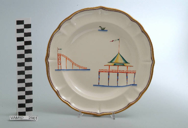 - NOTIZIE STORICO CRITICHE Il piatto fondo in esame fa parte del servizio forma "Vecchio Milano" con decoro "Lago Maggiore": vi sono raffigurati una veduta di una rotonda con grande tenda a strisce colorate e alcuni elementi caratteristici della vita sul lago (un trampolino a scivolo e un uccello che si riposa sull'acqua), rappresentati in un'atmosfera sospesa e silenziosa, seppur ridente nella resa stilizzata e nel fresco cromatismo delle raffigurazioni. Fin dalla sua nomina a direttore artistico della "S.C.I.", Guido Andlovitz si prefisse di rigenerare le forme tradizionali con decori nuovi. E' il caso della forma "Vecchio Milano" cui adattò nel 1931 il nuovissimo decoro "Lago Maggiore", a conferma che una decorazione nuova, se concepita organicamente, può conferire un aspetto attuale e "scattante" anche a una bella forma tradizionale. Fu certamente uno dei servizi più prestigiosi della produzione del momento se Andlovitz lo concepì in piccolissima serie e se l'azienda gli consentì - caso unico- di firmarlo nella marca. La scritta Verbano e la data 1931 presenti nel marchio suggeriscono che probabilmente il servizio fu realizzato per celebrare nel 1931 l'inizio della produzione di porcellana da tavola a Laveno nello stabilimento Verbano. Nell'ambito dei repertori decorativi creati dall'Andlovtz il decoro "Lago Maggiore" rappresenta un modo frazionato di raffigurare il paesaggio, definito da Mario Munari a "scena spezzata". L'impianto decorativo di queste ceramiche rifugge dalla centralità e dalla strutturazioni lungo diretrici ortogonali, mentre vi predominano l'asimmetria e le fughe visuali sghembe che risentono del gusto per la cineseria e il giapponismo. La semplificazione geometrica degli elementi e il modo di sfumare i corpi nel'intento di suggerirne la volumetria ricorda le opere di Carlo Carrà degli anni venti. Nel decoro "Lago Maggiore" sono presenti espressioni diversificate di un tema molto caro a Guido Andlovitz: i "paesaggi d'acqua" con particolare ricorrenza delle 'barche' raffigurate in una vasta gamma di tipi, generalmente riprese da modelli reali e con divertenti variazioni fantastiche. Il decoro Lago fu applicato in un primo momento sulla forma "Vecchio Milano", poi sulla forma "Pomezia" (1936 ca.). Del decoro Lago esistono diversi disegni originali a matita, pastello, inchiostro e acquerello su carta conservati nel fondo archivistico della "S.C.I.": alcuni di questi raffigurano il decoro proprio sulla forma "Vecchio Milano" con le rifiniture che compaiono sui pezzi finiti. Nel Museo è conservato anche un altro servizio forma "Vecchio Milano" con decoro "Lago Maggiore", ma più ridotto nella quantità e nella varietà dei componenti e con filettatura monocroma (num. inv. 2051...3517). Negli anni '90 la Richard Ginori ha rimesso in produzione il servizio Lago.\nIl servizio in esame è eseguito a colaggio, mentre i decori sono realizzati a decalcomania (o transfer): si vedano in proposito le lastre in rame acciaiato conservate nel Museo e raffiguranti molti dei decori presenti nel servizio in combinazioni diversificate (nn. inv. 2480, 2483, 2484, 2485). Tipologicamente si lega ad un servizio da caffé (num. inv. 2672...2900).\nIl piatto fondo è stato donato da Vanna Scotti Meregalli, nipote di Vanna Scotti, figlia dell'Ing. Luciano Scotti che fu direttore generale della "S.C.I." dal 1916.