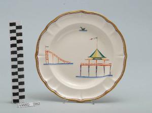 - NOTIZIE STORICO CRITICHE Il piatto fondo in esame fa parte del servizio forma "Vecchio Milano" con decoro "Lago Maggiore": vi sono raffigurati una veduta di una rotonda con grande tenda a strisce colorate e alcuni elementi caratteristici della vita sul lago (un trampolino a scivolo e un uccello che si riposa sull'acqua), rappresentati in un'atmosfera sospesa e silenziosa, seppur ridente nella resa stilizzata e nel fresco cromatismo delle raffigurazioni. Fin dalla sua nomina a direttore artistico della "S.C.I.", Guido Andlovitz si prefisse di rigenerare le forme tradizionali con decori nuovi. E' il caso della forma "Vecchio Milano" cui adattò nel 1931 il nuovissimo decoro "Lago Maggiore", a conferma che una decorazione nuova, se concepita organicamente, può conferire un aspetto attuale e "scattante" anche a una bella forma tradizionale. Fu certamente uno dei servizi più prestigiosi della produzione del momento se Andlovitz lo concepì in piccolissima serie e se l'azienda gli consentì - caso unico- di firmarlo nella marca. La scritta Verbano e la data 1931 presenti nel marchio suggeriscono che probabilmente il servizio fu realizzato per celebrare nel 1931 l'inizio della produzione di porcellana da tavola a Laveno nello stabilimento Verbano. Nell'ambito dei repertori decorativi creati dall'Andlovtz il decoro "Lago Maggiore" rappresenta un modo frazionato di raffigurare il paesaggio, definito da Mario Munari a "scena spezzata". L'impianto decorativo di queste ceramiche rifugge dalla centralità e dalla strutturazioni lungo diretrici ortogonali, mentre vi predominano l'asimmetria e le fughe visuali sghembe che risentono del gusto per la cineseria e il giapponismo. La semplificazione geometrica degli elementi e il modo di sfumare i corpi nel'intento di suggerirne la volumetria ricorda le opere di Carlo Carrà degli anni venti. Nel decoro "Lago Maggiore" sono presenti espressioni diversificate di un tema molto caro a Guido Andlovitz: i "paesaggi d'acqua" con particolare ricorrenza delle 'barche' raffigurate in una vasta gamma di tipi, generalmente riprese da modelli reali e con divertenti variazioni fantastiche. Il decoro Lago fu applicato in un primo momento sulla forma "Vecchio Milano", poi sulla forma "Pomezia" (1936 ca.). Del decoro Lago esistono diversi disegni originali a matita, pastello, inchiostro e acquerello su carta conservati nel fondo archivistico della "S.C.I.": alcuni di questi raffigurano il decoro proprio sulla forma "Vecchio Milano" con le rifiniture che compaiono sui pezzi finiti. Nel Museo è conservato anche un altro servizio forma "Vecchio Milano" con decoro "Lago Maggiore", ma più ridotto nella quantità e nella varietà dei componenti e con filettatura monocroma (num. inv. 2051...3517). Negli anni '90 la Richard Ginori ha rimesso in produzione il servizio Lago.\nIl servizio in esame è eseguito a colaggio, mentre i decori sono realizzati a decalcomania (o transfer): si vedano in proposito le lastre in rame acciaiato conservate nel Museo e raffiguranti molti dei decori presenti nel servizio in combinazioni diversificate (nn. inv. 2480, 2483, 2484, 2485). Tipologicamente si lega ad un servizio da caffé (num. inv. 2672...2900).\nIl piatto fondo è stato donato da Vanna Scotti Meregalli, nipote di Vanna Scotti, figlia dell'Ing. Luciano Scotti che fu direttore generale della "S.C.I." dal 1916.