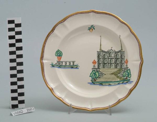 - NOTIZIE STORICO CRITICHE Il piatto fondo in esame fa parte del servizio forma "Vecchio Milano" con decoro "Lago Maggiore": vi sono raffigurati una veduta del Ninfeo nell'Isola Bella e alcuni elementi caratteristici della vita sul lago (la balaustrata con vaso decorativo tipici di tanti giardini storici che si affacciano sul lago e il frutto del limone), rappresentati in un'atmosfera sospesa e silenziosa, seppur ridente nella resa stilizzata e nel fresco cromatismo delle raffigurazioni. Questa stessa combinazione dei tre soggetti è presente in un disegno autografo dell'Andlovitz (cfr. "Guido Andloviz. Designer e direttore ...", 1995, p. 70 fig. 98). Fin dalla sua nomina a direttore artistico della "S.C.I.", Guido Andlovitz si prefisse di rigenerare le forme tradizionali con decori nuovi. E' il caso della forma "Vecchio Milano" cui adattò nel 1931 il nuovissimo decoro "Lago Maggiore", a conferma che una decorazione nuova, se concepita organicamente, può conferire un aspetto attuale e "scattante" anche a una bella forma tradizionale. Fu certamente uno dei servizi più prestigiosi della produzione del momento se Andlovitz lo concepì in piccolissima serie e se l'azienda gli consentì - caso unico- di firmarlo nella marca. La scritta Verbano e la data 1931 presenti nel marchio suggeriscono che probabilmente il servizio fu realizzato per celebrare nel 1931 l'inizio della produzione di porcellana da tavola a Laveno nello stabilimento Verbano. Nell'ambito dei repertori decorativi creati dall'Andlovtz il decoro "Lago Maggiore" rappresenta un modo frazionato di raffigurare il paesaggio, definito da Mario Munari a "scena spezzata". L'impianto decorativo di queste ceramiche rifugge dalla centralità e dalla strutturazioni lungo diretrici ortogonali, mentre vi predominano l'asimmetria e le fughe visuali sghembe che risentono del gusto per la cineseria e il giapponismo. La semplificazione geometrica degli elementi e il modo di sfumare i corpi nel'intento di suggerirne la volumetria ricorda le opere di Carlo Carrà degli anni venti. Nel decoro "Lago Maggiore" sono presenti espressioni diversificate di un tema molto caro a Guido Andlovitz: i "paesaggi d'acqua" con particolare ricorrenza delle 'barche' raffigurate in una vasta gamma di tipi, generalmente riprese da modelli reali e con divertenti variazioni fantastiche. Il decoro Lago fu applicato in un primo momento sulla forma "Vecchio Milano", poi sulla forma "Pomezia" (1936 ca.). Del decoro Lago esistono diversi disegni originali a matita, pastello, inchiostro e acquerello su carta conservati nel fondo archivistico della "S.C.I.": alcuni di questi raffigurano il decoro proprio sulla forma "Vecchio Milano" con le rifiniture che compaiono sui pezzi finiti. Nel Museo è conservato anche un altro servizio forma "Vecchio Milano" con decoro "Lago Maggiore", ma più ridotto nella quantità e nella varietà dei componenti e con filettatura monocroma (num. inv. 2051...3517). Negli anni '90 la Richard Ginori ha rimesso in produzione il servizio Lago.\nIl servizio in esame è eseguito a colaggio, mentre i decori sono realizzati a decalcomania (o transfer): si vedano in proposito le lastre in rame acciaiato conservate nel Museo e raffiguranti molti dei decori presenti nel servizio in combinazioni diversificate (nn. inv. 2480, 2483, 2484, 2485). Tipologicamente si lega ad un servizio da caffé (num. inv. 2672...2900).\nIl piatto fondo è stato donato da Vanna Scotti Meregalli, nipote di Vanna Scotti, figlia dell'Ing. Luciano Scotti che fu direttore generale della "S.C.I." dal 1916.