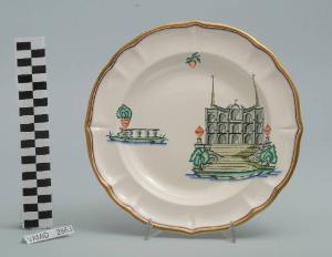 Piatto fondo avente la tesa leggermente sagomata e l'orlo ondulato. Il fondo è bianco mentre i decori sono a smalti policromi e sono distribuiti liberamente sul fondo del piatto e sulla tesa. L'orlo è dorato e rifinito da una piccola fascia smaltata a tratteggio incrociato in rosso.