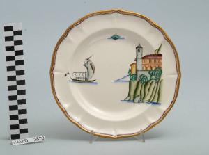 - NOTIZIE STORICO CRITICHE Il piatto fondo in esame fa parte del servizio forma "Vecchio Milano" con decoro "Lago Maggiore": vi sono raffigurati una veduta famosa, cioè quella dell'Eremo di santa Caterina del Sasso a Leggiuno, e alcuni elementi caratteristici della vita sul lago (una barca da pesca tipica, detta burchiello, e un pesce di lago che affiora dall'acqua), rappresentati in un'atmosfera sospesa e silenziosa, seppur ridente nella resa stilizzata e nel fresco cromatismo delle raffigurazioni. Fin dalla sua nomina a direttore artistico della "S.C.I.", Guido Andlovitz si prefisse di rigenerare le forme tradizionali con decori nuovi. E' il caso della forma "Vecchio Milano" cui adattò nel 1931 il nuovissimo decoro "Lago Maggiore", a conferma che una decorazione nuova, se concepita organicamente, può conferire un aspetto attuale e "scattante" anche a una bella forma tradizionale. Fu certamente uno dei servizi più prestigiosi della produzione del momento se Andlovitz lo concepì in piccolissima serie e se l'azienda gli consentì - caso unico- di firmarlo nella marca. La scritta Verbano e la data 1931 presenti nel marchio suggeriscono che probabilmente il servizio fu realizzato per celebrare nel 1931 l'inizio della produzione di porcellana da tavola a Laveno nello stabilimento Verbano. Nell'ambito dei repertori decorativi creati dall'Andlovtz il decoro "Lago Maggiore" rappresenta un modo frazionato di raffigurare il paesaggio, definito da Mario Munari a "scena spezzata". L'impianto decorativo di queste ceramiche rifugge dalla centralità e dalla strutturazioni lungo diretrici ortogonali, mentre vi predominano l'asimmetria e le fughe visuali sghembe che risentono del gusto per la cineseria e il giapponismo. La semplificazione geometrica degli elementi e il modo di sfumare i corpi nel'intento di suggerirne la volumetria ricorda le opere di Carlo Carrà degli anni venti. Nel decoro "Lago Maggiore" sono presenti espressioni diversificate di un tema molto caro a Guido Andlovitz: i "paesaggi d'acqua" con particolare ricorrenza delle 'barche' raffigurate in una vasta gamma di tipi, generalmente riprese da modelli reali e con divertenti variazioni fantastiche. Il decoro Lago fu applicato in un primo momento sulla forma "Vecchio Milano", poi sulla forma "Pomezia" (1936 ca.). Del decoro Lago esistono diversi disegni originali a matita, pastello, inchiostro e acquerello su carta conservati nel fondo archivistico della "S.C.I.": alcuni di questi raffigurano il decoro proprio sulla forma "Vecchio Milano" con le rifiniture che compaiono sui pezzi finiti. Nel Museo è conservato anche un altro servizio forma "Vecchio Milano" con decoro "Lago Maggiore", ma più ridotto nella quantità e nella varietà dei componenti e con filettatura monocroma (num. inv. 2051...3517). Negli anni '90 la Richard Ginori ha rimesso in produzione il servizio Lago.\nIl servizio in esame è eseguito a colaggio, mentre i decori sono realizzati a decalcomania (o transfer): si vedano in proposito le lastre in rame acciaiato conservate nel Museo e raffiguranti molti dei decori presenti nel servizio in combinazioni diversificate (nn. inv. 2480, 2483, 2484, 2485). Tipologicamente si lega ad un servizio da caffé (num. inv. 2672...2900).\nIl piatto fondo è stato donato da Vanna Scotti Meregalli, nipote di Vanna Scotti, figlia dell'Ing. Luciano Scotti che fu direttore generale della "S.C.I." dal 1916.
