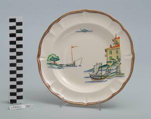 - NOTIZIE STORICO CRITICHE Il piatto fondo in esame fa parte del servizio forma "Vecchio Milano" con decoro "Lago Maggiore": vi sono raffigurati uno scorcio minore con case su un arco che si affacciano sul lago e barche da pesca tipiche, dette burchielli, e alcuni elementi caratteristici della vita sul lago (un molo con un pescatore e un pesce di lago che affiora dall'acqua), rappresentati in un'atmosfera sospesa e silenziosa, seppur ridente nella resa stilizzata e nel fresco cromatismo delle raffigurazioni. Fin dalla sua nomina a direttore artistico della "S.C.I.", Guido Andlovitz si prefisse di rigenerare le forme tradizionali con decori nuovi. E' il caso della forma "Vecchio Milano" cui adattò nel 1931 il nuovissimo decoro "Lago Maggiore", a conferma che una decorazione nuova, se concepita organicamente, può conferire un aspetto attuale e "scattante" anche a una bella forma tradizionale. Fu certamente uno dei servizi più prestigiosi della produzione del momento se Andlovitz lo concepì in piccolissima serie e se l'azienda gli consentì - caso unico- di firmarlo nella marca. La scritta Verbano e la data 1931 presenti nel marchio suggeriscono che probabilmente il servizio fu realizzato per celebrare nel 1931 l'inizio della produzione di porcellana da tavola a Laveno nello stabilimento Verbano. Nell'ambito dei repertori decorativi creati dall'Andlovtz il decoro "Lago Maggiore" rappresenta un modo frazionato di raffigurare il paesaggio, definito da Mario Munari a "scena spezzata". L'impianto decorativo di queste ceramiche rifugge dalla centralità e dalla strutturazioni lungo diretrici ortogonali, mentre vi predominano l'asimmetria e le fughe visuali sghembe che risentono del gusto per la cineseria e il giapponismo. La semplificazione geometrica degli elementi e il modo di sfumare i corpi nel'intento di suggerirne la volumetria ricorda le opere di Carlo Carrà degli anni venti. Nel decoro "Lago Maggiore" sono presenti espressioni diversificate di un tema molto caro a Guido Andlovitz: i "paesaggi d'acqua" con particolare ricorrenza delle 'barche' raffigurate in una vasta gamma di tipi, generalmente riprese da modelli reali e con divertenti variazioni fantastiche. Il decoro Lago fu applicato in un primo momento sulla forma "Vecchio Milano", poi sulla forma "Pomezia" (1936 ca.). Del decoro Lago esistono diversi disegni originali a matita, pastello, inchiostro e acquerello su carta conservati nel fondo archivistico della "S.C.I.": alcuni di questi raffigurano il decoro proprio sulla forma "Vecchio Milano" con le rifiniture che compaiono sui pezzi finiti. Nel Museo è conservato anche un altro servizio forma "Vecchio Milano" con decoro "Lago Maggiore", ma più ridotto nella quantità e nella varietà dei componenti e con filettatura monocroma (num. inv. 2051...3517). Negli anni '90 la Richard Ginori ha rimesso in produzione il servizio Lago.\nIl servizio in esame è eseguito a colaggio, mentre i decori sono realizzati a decalcomania (o transfer): si vedano in proposito le lastre in rame acciaiato conservate nel Museo e raffiguranti molti dei decori presenti nel servizio in combinazioni diversificate (nn. inv. 2480, 2483, 2484, 2485). Tipologicamente si lega ad un servizio da caffé (num. inv. 2672...2900).\nIl piatto fondo è stato donato da Vanna Scotti Meregalli, nipote di Vanna Scotti, figlia dell'Ing. Luciano Scotti che fu direttore generale della "S.C.I." dal 1916.