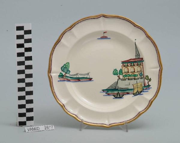 - NOTIZIE STORICO CRITICHE Il piatto fondo in esame fa parte del servizio forma "Vecchio Milano" con decoro "Lago Maggiore": vi sono raffigurati una veduta dell'Isola dei Pescatori con il campanile della chiesa svettante dalle case e due barche da pesca e alcuni elementi caratteristici della vita sul lago (le reti ad asciugare sulla riva e una boa segnaletica con bandierina), rappresentati in un'atmosfera sospesa e silenziosa, seppur ridente nella resa stilizzata e nel fresco cromatismo delle raffigurazioni. Questa stessa combinazione dei tre soggetti è presente in un disegno autografo dell'Andlovitz (cfr. "Guido Andloviz. Designer e direttore ...", 1995, p. 70 fig. 98). Fin dalla sua nomina a direttore artistico della "S.C.I.", Guido Andlovitz si prefisse di rigenerare le forme tradizionali con decori nuovi. E' il caso della forma "Vecchio Milano" cui adattò nel 1931 il nuovissimo decoro "Lago Maggiore", a conferma che una decorazione nuova, se concepita organicamente, può conferire un aspetto attuale e "scattante" anche a una bella forma tradizionale. Fu certamente uno dei servizi più prestigiosi della produzione del momento se Andlovitz lo concepì in piccolissima serie e se l'azienda gli consentì - caso unico- di firmarlo nella marca. La scritta Verbano e la data 1931 presenti nel marchio suggeriscono che probabilmente il servizio fu realizzato per celebrare nel 1931 l'inizio della produzione di porcellana da tavola a Laveno nello stabilimento Verbano. Nell'ambito dei repertori decorativi creati dall'Andlovtz il decoro "Lago Maggiore" rappresenta un modo frazionato di raffigurare il paesaggio, definito da Mario Munari a "scena spezzata". L'impianto decorativo di queste ceramiche rifugge dalla centralità e dalla strutturazioni lungo diretrici ortogonali, mentre vi predominano l'asimmetria e le fughe visuali sghembe che risentono del gusto per la cineseria e il giapponismo. La semplificazione geometrica degli elementi e il modo di sfumare i corpi nel'intento di suggerirne la volumetria ricorda le opere di Carlo Carrà degli anni venti. Nel decoro "Lago Maggiore" sono presenti espressioni diversificate di un tema molto caro a Guido Andlovitz: i "paesaggi d'acqua" con particolare ricorrenza delle 'barche' raffigurate in una vasta gamma di tipi, generalmente riprese da modelli reali e con divertenti variazioni fantastiche. Il decoro Lago fu applicato in un primo momento sulla forma "Vecchio Milano", poi sulla forma "Pomezia" (1936 ca.). Del decoro Lago esistono diversi disegni originali a matita, pastello, inchiostro e acquerello su carta conservati nel fondo archivistico della "S.C.I.": alcuni di questi raffigurano il decoro proprio sulla forma "Vecchio Milano" con le rifiniture che compaiono sui pezzi finiti. Nel Museo è conservato anche un altro servizio forma "Vecchio Milano" con decoro "Lago Maggiore", ma più ridotto nella quantità e nella varietà dei componenti e con filettatura monocroma (num. inv. 2051...3517). Negli anni '90 la Richard Ginori ha rimesso in produzione il servizio Lago.\nIl servizio in esame è eseguito a colaggio, mentre i decori sono realizzati a decalcomania (o transfer): si vedano in proposito le lastre in rame acciaiato conservate nel Museo e raffiguranti molti dei decori presenti nel servizio in combinazioni diversificate (nn. inv. 2480, 2483, 2484, 2485). Tipologicamente si lega ad un servizio da caffé (num. inv. 2672...2900).\nIl piatto fondo è stato donato da Vanna Scotti Meregalli, nipote di Vanna Scotti, figlia dell'Ing. Luciano Scotti che fu direttore generale della "S.C.I." dal 1916.