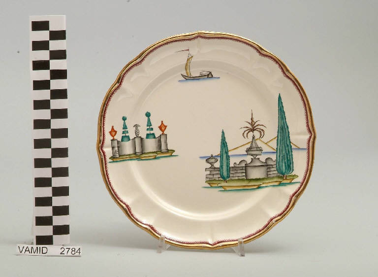 - NOTIZIE STORICO CRITICHE Il piatto da frutta in esame fa parte del servizio forma "Vecchio Milano" con decoro "Lago Maggiore": vi sono raffigurati una veduta di un giardino all'italiana che si affaccia sul lago e che è caratterizzato da una fontana in pietra, cipressi potati secondo l'ars topiaria ed elementi decorativi anch'essi in pietra che arricchiscono il parapetto sul lago. Insieme alla veduta, oltre allla solita barca a vela sospinta dal vento, è presente un altro decoro riferito ai giardini del lago: una recinzione in muratuta con vasi decorativi da cui spuntano due cipressi 'topiarizzati'. Per il suo clima mite e la posizione amena e soleggiata il Lago Maggiore è da sempre luogo di ville e di giardini splendidi come il grandioso giardino barocco all'italiana dell'Isola Bella o quello stupendo in stile inglese dell'Isola Madre o, ancora, quelli che attorniano molte ville storiche come la villa Pallavicini a Stresa, la Villa De Angeli Frua a Laveno o quella Bozzolo a Casalzuigno. Inevitabile che Andlovitz cogliesse in questi affascinanti insiemi di natura, arte e paesaggio una delle peculiarità più interessanti del Lago da riproporre in svariate declinazioni sul suo straordinario servizio. Questi decori sono rappresentati in un'atmosfera sospesa e silenziosa, seppur ridente nella resa stilizzata e nel fresco cromatismo delle raffigurazioni. Fin dalla sua nomina a direttore artistico della "S.C.I.", Guido Andlovitz si prefisse di rigenerare le forme tradizionali con decori nuovi. E' il caso della forma "Vecchio Milano" cui adattò nel 1931 il nuovissimo decoro "Lago Maggiore", a conferma che una decorazione nuova, se concepita organicamente, può conferire un aspetto attuale e "scattante" anche a una bella forma tradizionale. Fu certamente uno dei servizi più prestigiosi della produzione del momento se Andlovitz lo concepì in piccolissima serie e se l'azienda gli consentì - caso unico- di firmarlo nella marca. La scritta Verbano e la data 1931 presenti nel marchio suggeriscono che probabilmente il servizio fu realizzato per celebrare nel 1931 l'inizio della produzione di porcellana da tavola a Laveno nello stabilimento Verbano. Nell'ambito dei repertori decorativi creati dall'Andlovtz il decoro "Lago Maggiore" rappresenta un modo frazionato di raffigurare il paesaggio, definito da Mario Munari a "scena spezzata". L'impianto decorativo di queste ceramiche rifugge dalla centralità e dalla strutturazioni lungo diretrici ortogonali, mentre vi predominano l'asimmetria e le fughe visuali sghembe che risentono del gusto per la cineseria e il giapponismo. La semplificazione geometrica degli elementi e il modo di sfumare i corpi nel'intento di suggerirne la volumetria ricorda le opere di Carlo Carrà degli anni venti. Nel decoro "Lago Maggiore" sono presenti espressioni diversificate di un tema molto caro a Guido Andlovitz: i "paesaggi d'acqua" con particolare ricorrenza delle 'barche' raffigurate in una vasta gamma di tipi, generalmente riprese da modelli reali e con divertenti variazioni fantastiche. Il decoro Lago fu applicato in un primo momento sulla forma "Vecchio Milano", poi sulla forma "Pomezia" (1936 ca.). Del decoro Lago esistono diversi disegni originali a matita, pastello, inchiostro e acquerello su carta conservati nel fondo archivistico della "S.C.I.": alcuni di questi raffigurano il decoro proprio sulla forma "Vecchio Milano" con le rifiniture che compaiono sui pezzi finiti. Nel Museo è conservato anche un altro servizio forma "Vecchio Milano" con decoro "Lago Maggiore", ma più ridotto nella quantità e nella varietà dei componenti e con filettatura monocroma (num. inv. 2051...3517). Negli anni '90 la Richard Ginori ha rimesso in produzione il servizio Lago.\nIl servizio in esame è eseguito a colaggio, mentre i decori sono realizzati a decalcomania (o transfer): si vedano in proposito le lastre in rame acciaiato conservate nel Museo e raffiguranti molti dei decori presenti nel servizio in combinazioni diversificate (nn. inv. 2480, 2483, 2484, 2484, 2485).
