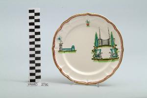 - NOTIZIE STORICO CRITICHE Il piatto da frutta in esame fa parte del servizio forma "Vecchio Milano" con decoro "Lago Maggiore": vi è raffigurata una veduta di un giardino all'italiana con un'esedra in muratura sullo sfondo con obelischi, cipressi e siepi di bossolo potati secondo l'ars topiaria. Insieme alla veduta sono presenti altri due decori in riferimento ai giardini del lago: una siepe di bosso con un vaso decorativo con palmizio e un vaso di coccio con una pianta ornamentale. Per il suo clima mite e la posizione amena e soleggiata il Lago Maggiore è da sempre luogo di ville e di giardini splendidi come il grandioso giardino barocco all'italiana dell'Isola Bella o quello stupendo in stile inglese dell'Isola Madre o, ancora, quelli che attorniano molte ville storiche come la villa Pallavicini a Stresa, la Villa De Angeli Frua a Laveno o quella Bozzolo a Casalzuigno. Inevitabile che Andlovitz cogliesse in questi affascinanti insiemi di natura, arte e paesaggio una delle peculiarità più interessanti del Lago da riproporre in svariate declinazioni sul suo straordinario servizio. Questi decori sono rappresentati in un'atmosfera sospesa e silenziosa, seppur ridente nella resa stilizzata e nel fresco cromatismo delle raffigurazioni. Fin dalla sua nomina a direttore artistico della "S.C.I.", Guido Andlovitz si prefisse di rigenerare le forme tradizionali con decori nuovi. E' il caso della forma "Vecchio Milano" cui adattò nel 1931 il nuovissimo decoro "Lago Maggiore", a conferma che una decorazione nuova, se concepita organicamente, può conferire un aspetto attuale e "scattante" anche a una bella forma tradizionale. Fu certamente uno dei servizi più prestigiosi della produzione del momento se Andlovitz lo concepì in piccolissima serie e se l'azienda gli consentì - caso unico- di firmarlo nella marca. La scritta Verbano e la data 1931 presenti nel marchio suggeriscono che probabilmente il servizio fu realizzato per celebrare nel 1931 l'inizio della produzione di porcellana da tavola a Laveno nello stabilimento Verbano. Nell'ambito dei repertori decorativi creati dall'Andlovtz il decoro "Lago Maggiore" rappresenta un modo frazionato di raffigurare il paesaggio, definito da Mario Munari a "scena spezzata". L'impianto decorativo di queste ceramiche rifugge dalla centralità e dalla strutturazioni lungo diretrici ortogonali, mentre vi predominano l'asimmetria e le fughe visuali sghembe che risentono del gusto per la cineseria e il giapponismo. La semplificazione geometrica degli elementi e il modo di sfumare i corpi nel'intento di suggerirne la volumetria ricorda le opere di Carlo Carrà degli anni venti. Nel decoro "Lago Maggiore" sono presenti espressioni diversificate di un tema molto caro a Guido Andlovitz: i "paesaggi d'acqua" con particolare ricorrenza delle 'barche' raffigurate in una vasta gamma di tipi, generalmente riprese da modelli reali e con divertenti variazioni fantastiche. Il decoro Lago fu applicato in un primo momento sulla forma "Vecchio Milano", poi sulla forma "Pomezia" (1936 ca.). Del decoro Lago esistono diversi disegni originali a matita, pastello, inchiostro e acquerello su carta conservati nel fondo archivistico della "S.C.I.": alcuni di questi raffigurano il decoro proprio sulla forma "Vecchio Milano" con le rifiniture che compaiono sui pezzi finiti. Nel Museo è conservato anche un altro servizio forma "Vecchio Milano" con decoro "Lago Maggiore", ma più ridotto nella quantità e nella varietà dei componenti e con filettatura monocroma (num. inv. 2051...3517). Negli anni '90 la Richard Ginori ha rimesso in produzione il servizio Lago.\nIl servizio in esame è eseguito a colaggio, mentre i decori sono realizzati a decalcomania (o transfer): si vedano in proposito le lastre in rame acciaiato conservate nel Museo e raffiguranti molti dei decori presenti nel servizio in combinazioni diversificate (nn. inv. 2480, 2483, 2484, 2485). Tipologicamente si lega ad un servizio da caffé (num. inv. 2672...2900).\nIl piatto da frutta è stato donato da