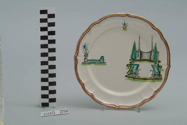 - NOTIZIE STORICO CRITICHE Il piatto da frutta in esame fa parte del servizio forma "Vecchio Milano" con decoro "Lago Maggiore": vi è raffigurata una veduta di un giardino all'italiana con un'esedra in muratura sullo sfondo con obelischi, cipressi e siepi di bossolo potati secondo l'ars topiaria. Insieme alla veduta sono presenti altri due decori in riferimento ai giardini del lago: una siepe di bosso con un vaso decorativo con palmizio e un vaso di coccio con una pianta ornamentale. Per il suo clima mite e la posizione amena e soleggiata il Lago Maggiore è da sempre luogo di ville e di giardini splendidi come il grandioso giardino barocco all'italiana dell'Isola Bella o quello stupendo in stile inglese dell'Isola Madre o, ancora, quelli che attorniano molte ville storiche come la villa Pallavicini a Stresa, la Villa De Angeli Frua a Laveno o quella Bozzolo a Casalzuigno. Inevitabile che Andlovitz cogliesse in questi affascinanti insiemi di natura, arte e paesaggio una delle peculiarità più interessanti del Lago da riproporre in svariate declinazioni sul suo straordinario servizio. Questi decori sono rappresentati in un'atmosfera sospesa e silenziosa, seppur ridente nella resa stilizzata e nel fresco cromatismo delle raffigurazioni. Fin dalla sua nomina a direttore artistico della "S.C.I.", Guido Andlovitz si prefisse di rigenerare le forme tradizionali con decori nuovi. E' il caso della forma "Vecchio Milano" cui adattò nel 1931 il nuovissimo decoro "Lago Maggiore", a conferma che una decorazione nuova, se concepita organicamente, può conferire un aspetto attuale e "scattante" anche a una bella forma tradizionale. Fu certamente uno dei servizi più prestigiosi della produzione del momento se Andlovitz lo concepì in piccolissima serie e se l'azienda gli consentì - caso unico- di firmarlo nella marca. La scritta Verbano e la data 1931 presenti nel marchio suggeriscono che probabilmente il servizio fu realizzato per celebrare nel 1931 l'inizio della produzione di porcellana da tavola a Laveno nello stabilimento Verbano. Nell'ambito dei repertori decorativi creati dall'Andlovtz il decoro "Lago Maggiore" rappresenta un modo frazionato di raffigurare il paesaggio, definito da Mario Munari a "scena spezzata". L'impianto decorativo di queste ceramiche rifugge dalla centralità e dalla strutturazioni lungo diretrici ortogonali, mentre vi predominano l'asimmetria e le fughe visuali sghembe che risentono del gusto per la cineseria e il giapponismo. La semplificazione geometrica degli elementi e il modo di sfumare i corpi nel'intento di suggerirne la volumetria ricorda le opere di Carlo Carrà degli anni venti. Nel decoro "Lago Maggiore" sono presenti espressioni diversificate di un tema molto caro a Guido Andlovitz: i "paesaggi d'acqua" con particolare ricorrenza delle 'barche' raffigurate in una vasta gamma di tipi, generalmente riprese da modelli reali e con divertenti variazioni fantastiche. Il decoro Lago fu applicato in un primo momento sulla forma "Vecchio Milano", poi sulla forma "Pomezia" (1936 ca.). Del decoro Lago esistono diversi disegni originali a matita, pastello, inchiostro e acquerello su carta conservati nel fondo archivistico della "S.C.I.": alcuni di questi raffigurano il decoro proprio sulla forma "Vecchio Milano" con le rifiniture che compaiono sui pezzi finiti. Nel Museo è conservato anche un altro servizio forma "Vecchio Milano" con decoro "Lago Maggiore", ma più ridotto nella quantità e nella varietà dei componenti e con filettatura monocroma (num. inv. 2051...3517). Negli anni '90 la Richard Ginori ha rimesso in produzione il servizio Lago.\nIl servizio in esame è eseguito a colaggio, mentre i decori sono realizzati a decalcomania (o transfer): si vedano in proposito le lastre in rame acciaiato conservate nel Museo e raffiguranti molti dei decori presenti nel servizio in combinazioni diversificate (nn. inv. 2480, 2483, 2484, 2485). Tipologicamente si lega ad un servizio da caffé (num. inv. 2672...2900).\nIl piatto da frutta è stato donato da