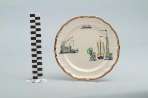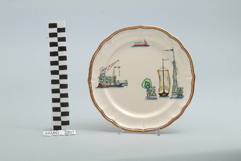 - NOTIZIE STORICO CRITICHE Il piatto da frutta in esame fa parte del servizio forma "Vecchio Milano" con decoro "Lago Maggiore": vi sono raffigurati uno scorcio (l'entrata di un porto con una barca da pesca in uscita e un pennone con scaletta d'avvistamento) ed elementi caratteristici della vita sul lago (una banchina con argano e una barca da pesca tipica, detta burchiello, in navigazione) rappresentati in un'atmosfera sospesa e silenziosa, seppur ridente nella resa stilizzata e nel fresco cromatismo delle raffigurazioni. Fin dalla sua nomina a direttore artistico della "S.C.I.", Guido Andlovitz si prefisse di rigenerare le forme tradizionali con decori nuovi. E' il caso della forma "Vecchio Milano" cui adattò nel 1931 il nuovissimo decoro "Lago Maggiore", a conferma che una decorazione nuova, se concepita organicamente, può conferire un aspetto attuale e "scattante" anche a una bella forma tradizionale. Fu certamente uno dei servizi più prestigiosi della produzione del momento se Andlovitz lo concepì in piccolissima serie e se l'azienda gli consentì - caso unico- di firmarlo nella marca. La scritta Verbano e la data 1931 presenti nel marchio suggeriscono che probabilmente il servizio fu realizzato per celebrare nel 1931 l'inizio della produzione di porcellana da tavola a Laveno nello stabilimento Verbano. Nell'ambito dei repertori decorativi creati dall'Andlovtz il decoro "Lago Maggiore" rappresenta un modo frazionato di raffigurare il paesaggio, definito da Mario Munari a "scena spezzata". L'impianto decorativo di queste ceramiche rifugge dalla centralità e dalla strutturazioni lungo diretrici ortogonali, mentre vi predominano l'asimmetria e le fughe visuali sghembe che risentono del gusto per la cineseria e il giapponismo. La semplificazione geometrica degli elementi e il modo di sfumare i corpi nel'intento di suggerirne la volumetria ricorda le opere di Carlo Carrà degli anni venti. Nel decoro "Lago Maggiore" sono presenti espressioni diversificate di un tema molto caro a Guido Andlovitz: i "paesaggi d'acqua" con particolare ricorrenza delle 'barche' raffigurate in una vasta gamma di tipi, generalmente riprese da modelli reali e con divertenti variazioni fantastiche. Il decoro Lago fu applicato in un primo momento sulla forma "Vecchio Milano", poi sulla forma "Pomezia" (1936 ca.). Del decoro Lago esistono diversi disegni originali a matita, pastello, inchiostro e acquerello su carta conservati nel fondo archivistico della "S.C.I.": alcuni di questi raffigurano il decoro proprio sulla forma "Vecchio Milano" con le rifiniture che compaiono sui pezzi finiti. Nel Museo è conservato anche un altro servizio forma "Vecchio Milano" con decoro "Lago Maggiore", ma più ridotto nella quantità e nella varietà dei componenti e con filettatura monocroma (num. inv. 2051...3517). Negli anni '90 la Richard Ginori ha rimesso in produzione il servizio Lago.\nIl servizio in esame è eseguito a colaggio, mentre i decori sono realizzati a decalcomania (o transfer): si vedano in proposito le lastre in rame acciaiato conservate nel Museo e raffiguranti molti dei decori presenti nel servizio in combinazioni diversificate (nn. inv. 2480, 2483, 2484, 2485). Tipologicamente si lega ad un servizio da caffé (num. inv. 2672...2900).\nIl piatto da frutta è stato donato da Vanna Scotti Meregalli, nipote di Vanna Scotti, figlia dell'Ing. Luciano Scotti che fu direttore generale della "S.C.I." dal 1916.