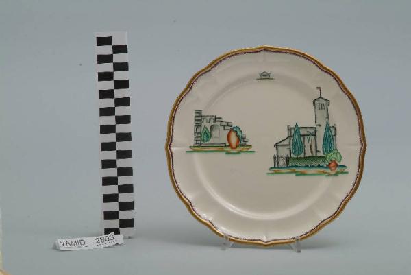 - NOTIZIE STORICO CRITICHE Il piatto da frutta in esame fa parte del servizio forma "Vecchio Milano" con decoro "Lago Maggiore": vi sono raffigurati una veduta laterale di una chiesa con campanile avente una cella campanaria aperta da bifore (vi sono delle affinità tra l'edificio in esame e la chiesa di Verbania Suna o quella di Oggebio) ed elementi caratteristici della vita sul lago (una scalinata in muratura con piante ornamentali e un vaso e un elemento simile a un piccolo sarcofago ma non chiaramente identificabile) rappresentati in un'atmosfera sospesa e silenziosa, seppur ridente nella resa stilizzata e nel fresco cromatismo delle raffigurazioni. Fin dalla sua nomina a direttore artistico della "S.C.I.", Guido Andlovitz si prefisse di rigenerare le forme tradizionali con decori nuovi. E' il caso della forma "Vecchio Milano" cui adattò nel 1931 il nuovissimo decoro "Lago Maggiore", a conferma che una decorazione nuova, se concepita organicamente, può conferire un aspetto attuale e "scattante" anche a una bella forma tradizionale. Fu certamente uno dei servizi più prestigiosi della produzione del momento se Andlovitz lo concepì in piccolissima serie e se l'azienda gli consentì - caso unico- di firmarlo nella marca. La scritta Verbano e la data 1931 presenti nel marchio suggeriscono che probabilmente il servizio fu realizzato per celebrare nel 1931 l'inizio della produzione di porcellana da tavola a Laveno nello stabilimento Verbano. Nell'ambito dei repertori decorativi creati dall'Andlovtz il decoro "Lago Maggiore" rappresenta un modo frazionato di raffigurare il paesaggio, definito da Mario Munari a "scena spezzata". L'impianto decorativo di queste ceramiche rifugge dalla centralità e dalla strutturazioni lungo diretrici ortogonali, mentre vi predominano l'asimmetria e le fughe visuali sghembe che risentono del gusto per la cineseria e il giapponismo. La semplificazione geometrica degli elementi e il modo di sfumare i corpi nel'intento di suggerirne la volumetria ricorda le opere di Carlo Carrà degli anni venti. Nel decoro "Lago Maggiore" sono presenti espressioni diversificate di un tema molto caro a Guido Andlovitz: i "paesaggi d'acqua" con particolare ricorrenza delle 'barche' raffigurate in una vasta gamma di tipi, generalmente riprese da modelli reali e con divertenti variazioni fantastiche. Il decoro Lago fu applicato in un primo momento sulla forma "Vecchio Milano", poi sulla forma "Pomezia" (1936 ca.). Del decoro Lago esistono diversi disegni originali a matita, pastello, inchiostro e acquerello su carta conservati nel fondo archivistico della "S.C.I.": alcuni di questi raffigurano il decoro proprio sulla forma "Vecchio Milano" con le rifiniture che compaiono sui pezzi finiti. Nel Museo è conservato anche un altro servizio forma "Vecchio Milano" con decoro "Lago Maggiore", ma più ridotto nella quantità e nella varietà dei componenti e con filettatura monocroma (num. inv. 2051...3517). Negli anni '90 la Richard Ginori ha rimesso in produzione il servizio Lago.\nIl servizio in esame è eseguito a colaggio, mentre i decori sono realizzati a decalcomania (o transfer): si vedano in proposito le lastre in rame acciaiato conservate nel Museo e raffiguranti molti dei decori presenti nel servizio in combinazioni diversificate (nn. inv. 2480, 2483, 2484, 2485). Tipologicamente si lega ad un servizio da caffé (num. inv. 2672...2900).\nIl piatto da frutta è stato donato da Vanna Scotti Meregalli, nipote di Vanna Scotti, figlia dell'Ing. Luciano Scotti che fu direttore generale della "S.C.I." dal 1916.
