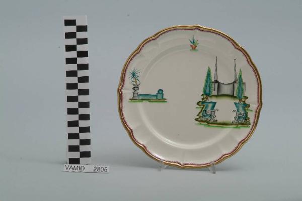 - NOTIZIE STORICO CRITICHE Il piatto da frutta in esame fa parte del servizio forma "Vecchio Milano" con decoro "Lago Maggiore": vi è raffigurata una veduta di un giardino all'italiana con un'esedra in muratura sullo sfondo con obelischi, cipressi e siepi di bossolo potati secondo l'ars topiaria. Insieme alla veduta sono presenti altri due decori in riferimento ai giardini del lago: una siepe di bosso con un vaso decorativo con palmizio e un vaso di coccio con una pianta ornamentale. Per il suo clima mite e la posizione amena e soleggiata il Lago Maggiore è da sempre luogo di ville e di giardini splendidi come il grandioso giardino barocco all'italiana dell'Isola Bella o quello stupendo in stile inglese dell'Isola Madre o, ancora, quelli che attorniano molte ville storiche come la villa Pallavicini a Stresa, la Villa De Angeli Frua a Laveno o quella Bozzolo a Casalzuigno. Inevitabile che Andlovitz cogliesse in questi affascinanti insiemi di natura, arte e paesaggio una delle peculiarità più interessanti del Lago da riproporre in svariate declinazioni sul suo straordinario servizio. Questi decori sono rappresentati in un'atmosfera sospesa e silenziosa, seppur ridente nella resa stilizzata e nel fresco cromatismo delle raffigurazioni. Fin dalla sua nomina a direttore artistico della "S.C.I.", Guido Andlovitz si prefisse di rigenerare le forme tradizionali con decori nuovi. E' il caso della forma "Vecchio Milano" cui adattò nel 1931 il nuovissimo decoro "Lago Maggiore", a conferma che una decorazione nuova, se concepita organicamente, può conferire un aspetto attuale e "scattante" anche a una bella forma tradizionale. Fu certamente uno dei servizi più prestigiosi della produzione del momento se Andlovitz lo concepì in piccolissima serie e se l'azienda gli consentì - caso unico- di firmarlo nella marca. La scritta Verbano e la data 1931 presenti nel marchio suggeriscono che probabilmente il servizio fu realizzato per celebrare nel 1931 l'inizio della produzione di porcellana da tavola a Laveno nello stabilimento Verbano. Nell'ambito dei repertori decorativi creati dall'Andlovtz il decoro "Lago Maggiore" rappresenta un modo frazionato di raffigurare il paesaggio, definito da Mario Munari a "scena spezzata". L'impianto decorativo di queste ceramiche rifugge dalla centralità e dalla strutturazioni lungo diretrici ortogonali, mentre vi predominano l'asimmetria e le fughe visuali sghembe che risentono del gusto per la cineseria e il giapponismo. La semplificazione geometrica degli elementi e il modo di sfumare i corpi nel'intento di suggerirne la volumetria ricorda le opere di Carlo Carrà degli anni venti. Nel decoro "Lago Maggiore" sono presenti espressioni diversificate di un tema molto caro a Guido Andlovitz: i "paesaggi d'acqua" con particolare ricorrenza delle 'barche' raffigurate in una vasta gamma di tipi, generalmente riprese da modelli reali e con divertenti variazioni fantastiche. Il decoro Lago fu applicato in un primo momento sulla forma "Vecchio Milano", poi sulla forma "Pomezia" (1936 ca.). Del decoro Lago esistono diversi disegni originali a matita, pastello, inchiostro e acquerello su carta conservati nel fondo archivistico della "S.C.I.": alcuni di questi raffigurano il decoro proprio sulla forma "Vecchio Milano" con le rifiniture che compaiono sui pezzi finiti. Nel Museo è conservato anche un altro servizio forma "Vecchio Milano" con decoro "Lago Maggiore", ma più ridotto nella quantità e nella varietà dei componenti e con filettatura monocroma (num. inv. 2051...3517). Negli anni '90 la Richard Ginori ha rimesso in produzione il servizio Lago.\nIl servizio in esame è eseguito a colaggio, mentre i decori sono realizzati a decalcomania (o transfer): si vedano in proposito le lastre in rame acciaiato conservate nel Museo e raffiguranti molti dei decori presenti nel servizio in combinazioni diversificate (nn. inv. 2480, 2483, 2484, 2485). Tipologicamente si lega ad un servizio da caffé (num. inv. 2672...2900).\nIl piatto da frutta è stato donato da
