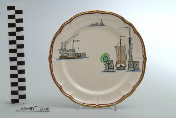 - NOTIZIE STORICO CRITICHE Il piatto da frutta in esame fa parte del servizio forma "Vecchio Milano" con decoro "Lago Maggiore": vi sono raffigurati uno scorcio (l'entrata di un porto con una barca da pesca in uscita e un pennone con scaletta d'avvistamento) ed elementi caratteristici della vita sul lago (una banchina con argano e una barca da pesca tipica, detta burchiello, in navigazione) rappresentati in un'atmosfera sospesa e silenziosa, seppur ridente nella resa stilizzata e nel fresco cromatismo delle raffigurazioni. Fin dalla sua nomina a direttore artistico della "S.C.I.", Guido Andlovitz si prefisse di rigenerare le forme tradizionali con decori nuovi. E' il caso della forma "Vecchio Milano" cui adattò nel 1931 il nuovissimo decoro "Lago Maggiore", a conferma che una decorazione nuova, se concepita organicamente, può conferire un aspetto attuale e "scattante" anche a una bella forma tradizionale. Fu certamente uno dei servizi più prestigiosi della produzione del momento se Andlovitz lo concepì in piccolissima serie e se l'azienda gli consentì - caso unico- di firmarlo nella marca. La scritta Verbano e la data 1931 presenti nel marchio suggeriscono che probabilmente il servizio fu realizzato per celebrare nel 1931 l'inizio della produzione di porcellana da tavola a Laveno nello stabilimento Verbano. Nell'ambito dei repertori decorativi creati dall'Andlovtz il decoro "Lago Maggiore" rappresenta un modo frazionato di raffigurare il paesaggio, definito da Mario Munari a "scena spezzata". L'impianto decorativo di queste ceramiche rifugge dalla centralità e dalla strutturazioni lungo diretrici ortogonali, mentre vi predominano l'asimmetria e le fughe visuali sghembe che risentono del gusto per la cineseria e il giapponismo. La semplificazione geometrica degli elementi e il modo di sfumare i corpi nel'intento di suggerirne la volumetria ricorda le opere di Carlo Carrà degli anni venti. Nel decoro "Lago Maggiore" sono presenti espressioni diversificate di un tema molto caro a Guido Andlovitz: i "paesaggi d'acqua" con particolare ricorrenza delle 'barche' raffigurate in una vasta gamma di tipi, generalmente riprese da modelli reali e con divertenti variazioni fantastiche. Il decoro Lago fu applicato in un primo momento sulla forma "Vecchio Milano", poi sulla forma "Pomezia" (1936 ca.). Del decoro Lago esistono diversi disegni originali a matita, pastello, inchiostro e acquerello su carta conservati nel fondo archivistico della "S.C.I.": alcuni di questi raffigurano il decoro proprio sulla forma "Vecchio Milano" con le rifiniture che compaiono sui pezzi finiti. Nel Museo è conservato anche un altro servizio forma "Vecchio Milano" con decoro "Lago Maggiore", ma più ridotto nella quantità e nella varietà dei componenti e con filettatura monocroma (num. inv. 2051...3517). Negli anni '90 la Richard Ginori ha rimesso in produzione il servizio Lago.\nIl servizio in esame è eseguito a colaggio, mentre i decori sono realizzati a decalcomania (o transfer): si vedano in proposito le lastre in rame acciaiato conservate nel Museo e raffiguranti molti dei decori presenti nel servizio in combinazioni diversificate (nn. inv. 2480, 2483, 2484, 2485). Tipologicamente si lega ad un servizio da caffé (num. inv. 2672...2900).\nIl piatto da frutta è stato donato da Vanna Scotti Meregalli, nipote di Vanna Scotti, figlia dell'Ing. Luciano Scotti che fu direttore generale della "S.C.I." dal 1916.