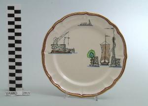 - NOTIZIE STORICO CRITICHE Il piatto da frutta in esame fa parte del servizio forma "Vecchio Milano" con decoro "Lago Maggiore": vi sono raffigurati uno scorcio (l'entrata di un porto con una barca da pesca in uscita e un pennone con scaletta d'avvistamento) ed elementi caratteristici della vita sul lago (una banchina con argano e una barca da pesca tipica, detta burchiello, in navigazione) rappresentati in un'atmosfera sospesa e silenziosa, seppur ridente nella resa stilizzata e nel fresco cromatismo delle raffigurazioni. Fin dalla sua nomina a direttore artistico della "S.C.I.", Guido Andlovitz si prefisse di rigenerare le forme tradizionali con decori nuovi. E' il caso della forma "Vecchio Milano" cui adattò nel 1931 il nuovissimo decoro "Lago Maggiore", a conferma che una decorazione nuova, se concepita organicamente, può conferire un aspetto attuale e "scattante" anche a una bella forma tradizionale. Fu certamente uno dei servizi più prestigiosi della produzione del momento se Andlovitz lo concepì in piccolissima serie e se l'azienda gli consentì - caso unico- di firmarlo nella marca. La scritta Verbano e la data 1931 presenti nel marchio suggeriscono che probabilmente il servizio fu realizzato per celebrare nel 1931 l'inizio della produzione di porcellana da tavola a Laveno nello stabilimento Verbano. Nell'ambito dei repertori decorativi creati dall'Andlovtz il decoro "Lago Maggiore" rappresenta un modo frazionato di raffigurare il paesaggio, definito da Mario Munari a "scena spezzata". L'impianto decorativo di queste ceramiche rifugge dalla centralità e dalla strutturazioni lungo diretrici ortogonali, mentre vi predominano l'asimmetria e le fughe visuali sghembe che risentono del gusto per la cineseria e il giapponismo. La semplificazione geometrica degli elementi e il modo di sfumare i corpi nel'intento di suggerirne la volumetria ricorda le opere di Carlo Carrà degli anni venti. Nel decoro "Lago Maggiore" sono presenti espressioni diversificate di un tema molto caro a Guido Andlovitz: i "paesaggi d'acqua" con particolare ricorrenza delle 'barche' raffigurate in una vasta gamma di tipi, generalmente riprese da modelli reali e con divertenti variazioni fantastiche. Il decoro Lago fu applicato in un primo momento sulla forma "Vecchio Milano", poi sulla forma "Pomezia" (1936 ca.). Del decoro Lago esistono diversi disegni originali a matita, pastello, inchiostro e acquerello su carta conservati nel fondo archivistico della "S.C.I.": alcuni di questi raffigurano il decoro proprio sulla forma "Vecchio Milano" con le rifiniture che compaiono sui pezzi finiti. Nel Museo è conservato anche un altro servizio forma "Vecchio Milano" con decoro "Lago Maggiore", ma più ridotto nella quantità e nella varietà dei componenti e con filettatura monocroma (num. inv. 2051...3517). Negli anni '90 la Richard Ginori ha rimesso in produzione il servizio Lago.\nIl servizio in esame è eseguito a colaggio, mentre i decori sono realizzati a decalcomania (o transfer): si vedano in proposito le lastre in rame acciaiato conservate nel Museo e raffiguranti molti dei decori presenti nel servizio in combinazioni diversificate (nn. inv. 2480, 2483, 2484, 2485). Tipologicamente si lega ad un servizio da caffé (num. inv. 2672...2900).\nIl piatto da frutta è stato donato da Vanna Scotti Meregalli, nipote di Vanna Scotti, figlia dell'Ing. Luciano Scotti che fu direttore generale della "S.C.I." dal 1916.