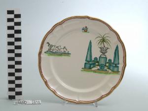 • NOTIZIE STORICO CRITICHE Il piatto da frutta in esame fa parte del servizio forma "Vecchio Milano" con decoro "Lago Maggiore": vi è raffigurata una veduta di un giardino all'italiana con cipressi e siepi di bossolo potati secondo l'ars topiaria ed elementi decorativi come un grande vaso in pietra contenente una palma nana. Insieme alla veduta sono presenti altri due decori in riferimento ai giardini del lago: un'inferriata in ferro battuto in stile Settecento (forse una recinzione) e un vaso di coccio con una pianta floreale. Per il suo clima mite e la posizione amena e soleggiata il Lago Maggiore è da sempre luogo di ville e di giardini splendidi come il grandioso giardino barocco all'italiana dell'Isola Bella o quello stupendo in stile inglese dell'Isola Madre o, ancora, quelli che attorniano molte ville storiche come la villa Pallavicini a Stresa, la Villa De Angeli Frua a Laveno o quella Bozzolo a Casalzuigno. Inevitabile che Andlovitz cogliesse in questi affascinanti insiemi di natura, arte e paesaggio una delle peculiarità più interessanti del Lago da riproporre in svariate declinazioni sul suo straordinario servizio. Questi decori sono rappresentati in un'atmosfera sospesa e silenziosa, seppur ridente nella resa stilizzata e nel fresco cromatismo delle raffigurazioni. Fin dalla sua nomina a direttore artistico della "S.C.I.", Guido Andlovitz si prefisse di rigenerare le forme tradizionali con decori nuovi. E' il caso della forma "Vecchio Milano" cui adattò nel 1931 il nuovissimo decoro "Lago Maggiore", a conferma che una decorazione nuova, se concepita organicamente, può conferire un aspetto attuale e "scattante" anche a una bella forma tradizionale. Fu certamente uno dei servizi più prestigiosi della produzione del momento se Andlovitz lo concepì in piccolissima serie e se l'azienda gli consentì - caso unico- di firmarlo nella marca. La scritta Verbano e la data 1931 presenti nel marchio suggeriscono che probabilmente il servizio fu realizzato per celebrare nel 1931 l'inizio della produzione di porcellana da tavola a Laveno nello stabilimento Verbano. Nell'ambito dei repertori decorativi creati dall'Andlovtz il decoro "Lago Maggiore" rappresenta un modo frazionato di raffigurare il paesaggio, definito da Mario Munari a "scena spezzata". L'impianto decorativo di queste ceramiche rifugge dalla centralità e dalla strutturazioni lungo diretrici ortogonali, mentre vi predominano l'asimmetria e le fughe visuali sghembe che risentono del gusto per la cineseria e il giapponismo. La semplificazione geometrica degli elementi e il modo di sfumare i corpi nel'intento di suggerirne la volumetria ricorda le opere di Carlo Carrà degli anni venti. Nel decoro "Lago Maggiore" sono presenti espressioni diversificate di un tema molto caro a Guido Andlovitz: i "paesaggi d'acqua" con particolare ricorrenza delle 'barche' raffigurate in una vasta gamma di tipi, generalmente riprese da modelli reali e con divertenti variazioni fantastiche. Il decoro Lago fu applicato in un primo momento sulla forma "Vecchio Milano", poi sulla forma "Pomezia" (1936 ca.). Del decoro Lago esistono diversi disegni originali a matita, pastello, inchiostro e acquerello su carta conservati nel fondo archivistico della "S.C.I.": alcuni di questi raffigurano il decoro proprio sulla forma "Vecchio Milano" con le rifiniture che compaiono sui pezzi finiti. Nel Museo è conservato anche un altro servizio forma "Vecchio Milano" con decoro "Lago Maggiore", ma più ridotto nella quantità e nella varietà dei componenti e con filettatura monocroma (num. inv. 2051...3517). Negli anni '90 la Richard Ginori ha rimesso in produzione il servizio Lago.\nIl servizio in esame è eseguito a colaggio, mentre i decori sono realizzati a decalcomania (o transfer): si vedano in proposito le lastre in rame acciaiato conservate nel Museo e raffiguranti molti dei decori presenti nel servizio in combinazioni diversificate (nn. inv. 2480, 2483, 2484, 2485). Tipologicamente si lega ad un servizio da caffé (num. inv. 2672...