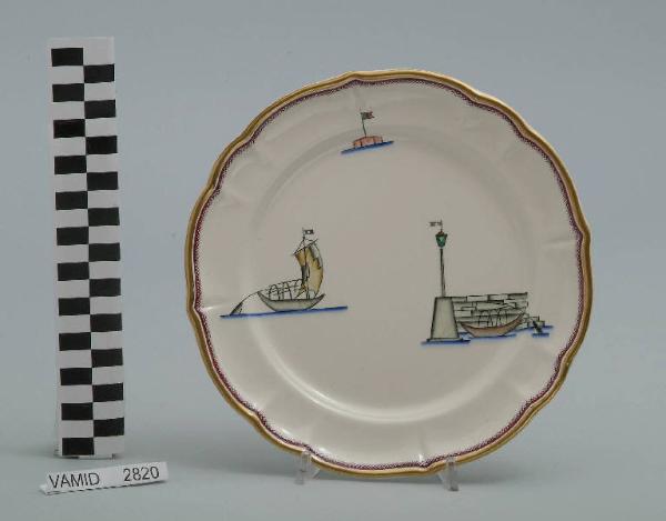 - NOTIZIE STORICO CRITICHE Il piatto da frutta in esame fa parte del servizio forma "Vecchio Milano" con decoro "Lago Maggiore": vi sono raffigurati elementi caratteristici della vita sul lago (un molo con faro e una barca tipica, detta burchiello, all'ancora, una boa con bandierina e un'altra barca da pesca in navigazione) rappresentati in un'atmosfera sospesa e silenziosa, seppur ridente nella resa stilizzata e nel fresco cromatismo delle raffigurazioni. Fin dalla sua nomina a direttore artistico della "S.C.I.", Guido Andlovitz si prefisse di rigenerare le forme tradizionali con decori nuovi. E' il caso della forma "Vecchio Milano" cui adattò nel 1931 il nuovissimo decoro "Lago Maggiore", a conferma che una decorazione nuova, se concepita organicamente, può conferire un aspetto attuale e "scattante" anche a una bella forma tradizionale. Fu certamente uno dei servizi più prestigiosi della produzione del momento se Andlovitz lo concepì in piccolissima serie e se l'azienda gli consentì - caso unico- di firmarlo nella marca. La scritta Verbano e la data 1931 presenti nel marchio suggeriscono che probabilmente il servizio fu realizzato per celebrare nel 1931 l'inizio della produzione di porcellana da tavola a Laveno nello stabilimento Verbano. Nell'ambito dei repertori decorativi creati dall'Andlovtz il decoro "Lago Maggiore" rappresenta un modo frazionato di raffigurare il paesaggio, definito da Mario Munari a "scena spezzata". L'impianto decorativo di queste ceramiche rifugge dalla centralità e dalla strutturazioni lungo diretrici ortogonali, mentre vi predominano l'asimmetria e le fughe visuali sghembe che risentono del gusto per la cineseria e il giapponismo. La semplificazione geometrica degli elementi e il modo di sfumare i corpi nel'intento di suggerirne la volumetria ricorda le opere di Carlo Carrà degli anni venti. Nel decoro "Lago Maggiore" sono presenti espressioni diversificate di un tema molto caro a Guido Andlovitz: i "paesaggi d'acqua" con particolare ricorrenza delle 'barche' raffigurate in una vasta gamma di tipi, generalmente riprese da modelli reali e con divertenti variazioni fantastiche. Il decoro Lago fu applicato in un primo momento sulla forma "Vecchio Milano", poi sulla forma "Pomezia" (1936 ca.). Del decoro Lago esistono diversi disegni originali a matita, pastello, inchiostro e acquerello su carta conservati nel fondo archivistico della "S.C.I.": alcuni di questi raffigurano il decoro proprio sulla forma "Vecchio Milano" con le rifiniture che compaiono sui pezzi finiti. Nel Museo è conservato anche un altro servizio forma "Vecchio Milano" con decoro "Lago Maggiore", ma più ridotto nella quantità e nella varietà dei componenti e con filettatura monocroma (num. inv. 2051...3517). Negli anni '90 la Richard Ginori ha rimesso in produzione il servizio Lago.\nIl servizio in esame è eseguito a colaggio, mentre i decori sono realizzati a decalcomania (o transfer): si vedano in proposito le lastre in rame acciaiato conservate nel Museo e raffiguranti molti dei decori presenti nel servizio in combinazioni diversificate (nn. inv. 2480, 2483, 2484, 2485). Tipologicamente si lega ad un servizio da caffé (num. inv. 2672...2900).\nIl piatto da frutta è stato donato da Vanna Scotti Meregalli, nipote di Vanna Scotti, figlia dell'Ing. Luciano Scotti che fu direttore generale della "S.C.I." dal 1916.