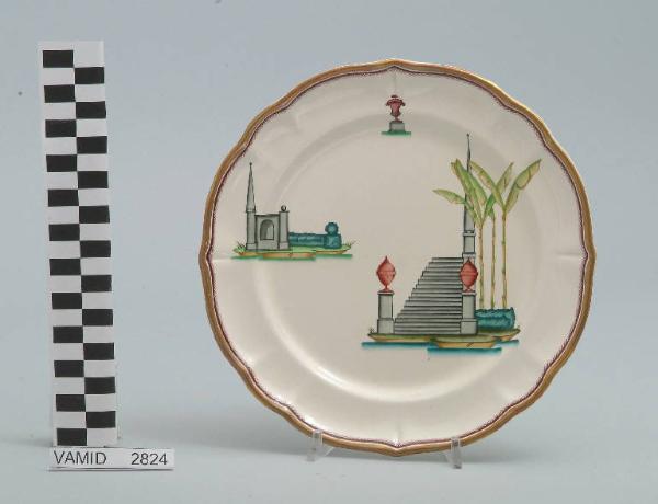 - NOTIZIE STORICO CRITICHE Il piatto da frutta in esame fa parte del servizio forma "Vecchio Milano" con decoro "Lago Maggiore": vi è raffigurata una veduta di un approdo di una villa con scalinata, sostegni in pietra scolpita e palme. Insieme alla veduta sono presenti due decori in riferimento ai giardini del lago: un parapetto in pietra con nicchia, obelisco e siepe di bosso potata secondo l'ars topiaria, e un vaso decorativo da giardino. Per il suo clima mite e la posizione amena e soleggiata il Lago Maggiore è da sempre luogo di ville e di giardini splendidi come il grandioso giardino barocco all'italiana dell'Isola Bella o quello stupendo in stile inglese dell'Isola Madre o, ancora, quelli che attorniano molte ville storiche come la villa Pallavicini a Stresa, la Villa De Angeli Frua a Laveno o quella Bozzolo a Casalzuigno. Inevitabile che Andlovitz cogliesse in questi affascinanti insiemi di natura, arte e paesaggio una delle peculiarità più interessanti del Lago da riproporre in svariate declinazioni sul suo straordinario servizio. Questi decori sono rappresentati in un'atmosfera sospesa e silenziosa, seppur ridente nella resa stilizzata e nel fresco cromatismo delle raffigurazioni. Fin dalla sua nomina a direttore artistico della "S.C.I.", Guido Andlovitz si prefisse di rigenerare le forme tradizionali con decori nuovi. E' il caso della forma "Vecchio Milano" cui adattò nel 1931 il nuovissimo decoro "Lago Maggiore", a conferma che una decorazione nuova, se concepita organicamente, può conferire un aspetto attuale e "scattante" anche a una bella forma tradizionale. Fu certamente uno dei servizi più prestigiosi della produzione del momento se Andlovitz lo concepì in piccolissima serie e se l'azienda gli consentì - caso unico- di firmarlo nella marca. La scritta Verbano e la data 1931 presenti nel marchio suggeriscono che probabilmente il servizio fu realizzato per celebrare nel 1931 l'inizio della produzione di porcellana da tavola a Laveno nello stabilimento Verbano. Nell'ambito dei repertori decorativi creati dall'Andlovtz il decoro "Lago Maggiore" rappresenta un modo frazionato di raffigurare il paesaggio, definito da Mario Munari a "scena spezzata". L'impianto decorativo di queste ceramiche rifugge dalla centralità e dalla strutturazioni lungo diretrici ortogonali, mentre vi predominano l'asimmetria e le fughe visuali sghembe che risentono del gusto per la cineseria e il giapponismo. La semplificazione geometrica degli elementi e il modo di sfumare i corpi nel'intento di suggerirne la volumetria ricorda le opere di Carlo Carrà degli anni venti. Nel decoro "Lago Maggiore" sono presenti espressioni diversificate di un tema molto caro a Guido Andlovitz: i "paesaggi d'acqua" con particolare ricorrenza delle 'barche' raffigurate in una vasta gamma di tipi, generalmente riprese da modelli reali e con divertenti variazioni fantastiche. Il decoro Lago fu applicato in un primo momento sulla forma "Vecchio Milano", poi sulla forma "Pomezia" (1936 ca.). Del decoro Lago esistono diversi disegni originali a matita, pastello, inchiostro e acquerello su carta conservati nel fondo archivistico della "S.C.I.": alcuni di questi raffigurano il decoro proprio sulla forma "Vecchio Milano" con le rifiniture che compaiono sui pezzi finiti. Nel Museo è conservato anche un altro servizio forma "Vecchio Milano" con decoro "Lago Maggiore", ma più ridotto nella quantità e nella varietà dei componenti e con filettatura monocroma (num. inv. 2051...3517). Negli anni '90 la Richard Ginori ha rimesso in produzione il servizio Lago.\nIl servizio in esame è eseguito a colaggio, mentre i decori sono realizzati a decalcomania (o transfer): si vedano in proposito le lastre in rame acciaiato conservate nel Museo e raffiguranti molti dei decori presenti nel servizio in combinazioni diversificate (nn. inv. 2480, 2483, 2484, 2485). Tipologicamente si lega ad un servizio da caffé (num. inv. 2672...2900).\nIl piatto da frutta è stato donato da Vanna Scotti Meregalli, nipote di Vanna Sco
