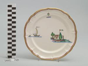 - NOTIZIE STORICO CRITICHE Il piatto da frutta in esame fa parte del servizio forma "Vecchio Milano" con decoro "Lago Maggiore": vi sono raffigurati uno scorcio (un fortino con bandiera italiana sulla riva del lago) ed elementi caratteristici della vita sul lago (una boa luminosa e una barca da pesca tipica, detta burchiello, in navigazione) rappresentati in un'atmosfera sospesa e silenziosa, seppur ridente nella resa stilizzata e nel fresco cromatismo delle raffigurazioni. Fin dalla sua nomina a direttore artistico della "S.C.I.", Guido Andlovitz si prefisse di rigenerare le forme tradizionali con decori nuovi. E' il caso della forma "Vecchio Milano" cui adattò nel 1931 il nuovissimo decoro "Lago Maggiore", a conferma che una decorazione nuova, se concepita organicamente, può conferire un aspetto attuale e "scattante" anche a una bella forma tradizionale. Fu certamente uno dei servizi più prestigiosi della produzione del momento se Andlovitz lo concepì in piccolissima serie e se l'azienda gli consentì - caso unico- di firmarlo nella marca. La scritta Verbano e la data 1931 presenti nel marchio suggeriscono che probabilmente il servizio fu realizzato per celebrare nel 1931 l'inizio della produzione di porcellana da tavola a Laveno nello stabilimento Verbano. Nell'ambito dei repertori decorativi creati dall'Andlovtz il decoro "Lago Maggiore" rappresenta un modo frazionato di raffigurare il paesaggio, definito da Mario Munari a "scena spezzata". L'impianto decorativo di queste ceramiche rifugge dalla centralità e dalla strutturazioni lungo diretrici ortogonali, mentre vi predominano l'asimmetria e le fughe visuali sghembe che risentono del gusto per la cineseria e il giapponismo. La semplificazione geometrica degli elementi e il modo di sfumare i corpi nel'intento di suggerirne la volumetria ricorda le opere di Carlo Carrà degli anni venti. Nel decoro "Lago Maggiore" sono presenti espressioni diversificate di un tema molto caro a Guido Andlovitz: i "paesaggi d'acqua" con particolare ricorrenza delle 'barche' raffigurate in una vasta gamma di tipi, generalmente riprese da modelli reali e con divertenti variazioni fantastiche. Il decoro Lago fu applicato in un primo momento sulla forma "Vecchio Milano", poi sulla forma "Pomezia" (1936 ca.). Del decoro Lago esistono diversi disegni originali a matita, pastello, inchiostro e acquerello su carta conservati nel fondo archivistico della "S.C.I.": alcuni di questi raffigurano il decoro proprio sulla forma "Vecchio Milano" con le rifiniture che compaiono sui pezzi finiti. Nel Museo è conservato anche un altro servizio forma "Vecchio Milano" con decoro "Lago Maggiore", ma più ridotto nella quantità e nella varietà dei componenti e con filettatura monocroma (num. inv. 2051...3517). Negli anni '90 la Richard Ginori ha rimesso in produzione il servizio Lago.\nIl servizio in esame è eseguito a colaggio, mentre i decori sono realizzati a decalcomania (o transfer): si vedano in proposito le lastre in rame acciaiato conservate nel Museo e raffiguranti molti dei decori presenti nel servizio in combinazioni diversificate (nn. inv. 2480, 2483, 2484, 2485). Tipologicamente si lega ad un servizio da caffé (num. inv. 2672...2900).\nIl piatto da frutta è stato donato da Vanna Scotti Meregalli, nipote di Vanna Scotti, figlia dell'Ing. Luciano Scotti che fu direttore generale della "S.C.I." dal 1916.