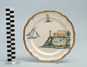 - NOTIZIE STORICO CRITICHE Il piatto da frutta in esame fa parte del servizio forma "Vecchio Milano" con decoro "Lago Maggiore": vi sono raffigurati uno scorcio (una terrazza sul lago con loggiato e tendaggi, forse appartenente a un albergo) ed elementi caratteristici della vita sul lago (una barca a vela a vele spiegate e una barca da pesca tipica, detta burchiello, in navigazione) rappresentati in un'atmosfera sospesa e silenziosa, seppur ridente nella resa stilizzata e nel fresco cromatismo delle raffigurazioni. Fin dalla sua nomina a direttore artistico della "S.C.I.", Guido Andlovitz si prefisse di rigenerare le forme tradizionali con decori nuovi. E' il caso della forma "Vecchio Milano" cui adattò nel 1931 il nuovissimo decoro "Lago Maggiore", a conferma che una decorazione nuova, se concepita organicamente, può conferire un aspetto attuale e "scattante" anche a una bella forma tradizionale. Fu certamente uno dei servizi più prestigiosi della produzione del momento se Andlovitz lo concepì in piccolissima serie e se l'azienda gli consentì - caso unico- di firmarlo nella marca. La scritta Verbano e la data 1931 presenti nel marchio suggeriscono che probabilmente il servizio fu realizzato per celebrare nel 1931 l'inizio della produzione di porcellana da tavola a Laveno nello stabilimento Verbano. Nell'ambito dei repertori decorativi creati dall'Andlovtz il decoro "Lago Maggiore" rappresenta un modo frazionato di raffigurare il paesaggio, definito da Mario Munari a "scena spezzata". L'impianto decorativo di queste ceramiche rifugge dalla centralità e dalla strutturazioni lungo diretrici ortogonali, mentre vi predominano l'asimmetria e le fughe visuali sghembe che risentono del gusto per la cineseria e il giapponismo. La semplificazione geometrica degli elementi e il modo di sfumare i corpi nel'intento di suggerirne la volumetria ricorda le opere di Carlo Carrà degli anni venti. Nel decoro "Lago Maggiore" sono presenti espressioni diversificate di un tema molto caro a Guido Andlovitz: i "paesaggi d'acqua" con particolare ricorrenza delle 'barche' raffigurate in una vasta gamma di tipi, generalmente riprese da modelli reali e con divertenti variazioni fantastiche. Il decoro Lago fu applicato in un primo momento sulla forma "Vecchio Milano", poi sulla forma "Pomezia" (1936 ca.). Del decoro Lago esistono diversi disegni originali a matita, pastello, inchiostro e acquerello su carta conservati nel fondo archivistico della "S.C.I.": alcuni di questi raffigurano il decoro proprio sulla forma "Vecchio Milano" con le rifiniture che compaiono sui pezzi finiti. Nel Museo è conservato anche un altro servizio forma "Vecchio Milano" con decoro "Lago Maggiore", ma più ridotto nella quantità e nella varietà dei componenti e con filettatura monocroma (num. inv. 2051...3517). Negli anni '90 la Richard Ginori ha rimesso in produzione il servizio Lago.\nIl servizio in esame è eseguito a colaggio, mentre i decori sono realizzati a decalcomania (o transfer): si vedano in proposito le lastre in rame acciaiato conservate nel Museo e raffiguranti molti dei decori presenti nel servizio in combinazioni diversificate (nn. inv. 2480, 2483, 2484, 2485). Tipologicamente si lega ad un servizio da caffé (num. inv. 2672...2900).\nIl piatto da frutta è stato donato da Vanna Scotti Meregalli, nipote di Vanna Scotti, figlia dell'Ing. Luciano Scotti che fu direttore generale della "S.C.I." dal 1916.